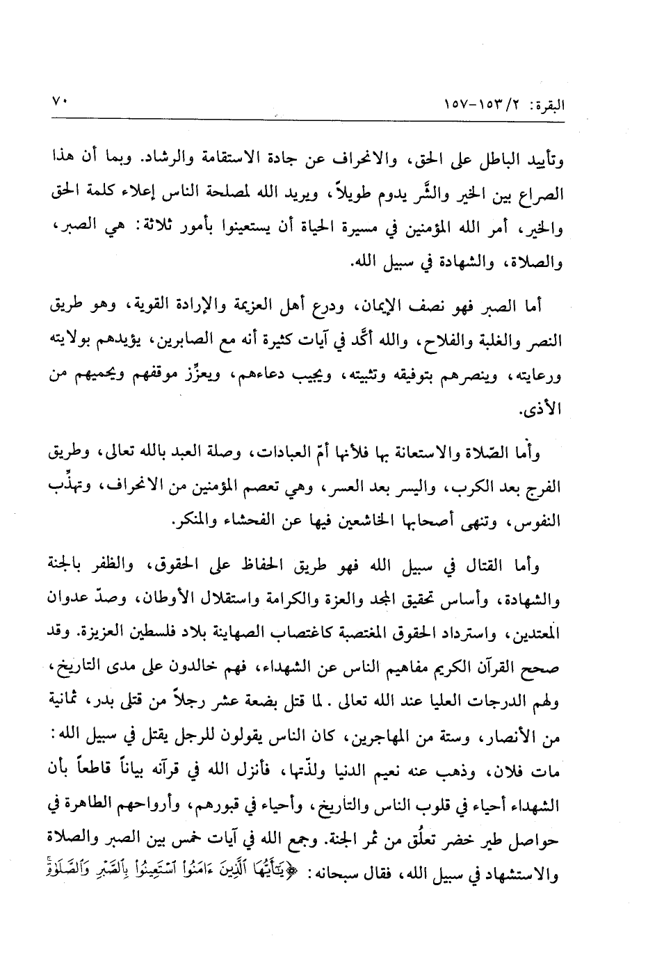 يا أَيُّهَا الَّذِينَ آمَنُوا اسْتَعِينُوا بِالصَّبْرِ وَالصَّلاةِ إِنَّ اللَّهَ مَعَ الصَّابِرِينَ (153) وَلا تَقُولُوا لِمَنْ يُقْتَلُ فِي سَبِيلِ اللَّهِ أَمْواتٌ بَلْ أَحْياءٌ وَلكِنْ لا تَشْعُرُونَ (154) وَلَنَبْلُوَنَّكُمْ بِشَيْءٍ مِنَ الْخَوْفِ وَالْجُوعِ وَنَقْصٍ مِنَ الْأَمْوالِ وَالْأَنْفُسِ وَالثَّمَراتِ وَبَشِّرِ الصَّابِرِينَ (155) الَّذِينَ إِذا أَصابَتْهُمْ مُصِيبَةٌ قالُوا إِنَّا لِلَّهِ وَإِنَّا إِلَيْهِ راجِعُونَ (156) أُولئِكَ عَلَيْهِمْ صَلَواتٌ مِنْ رَبِّهِمْ وَرَحْمَةٌ وَأُولئِكَ هُمُ الْمُهْتَدُونَ (157)