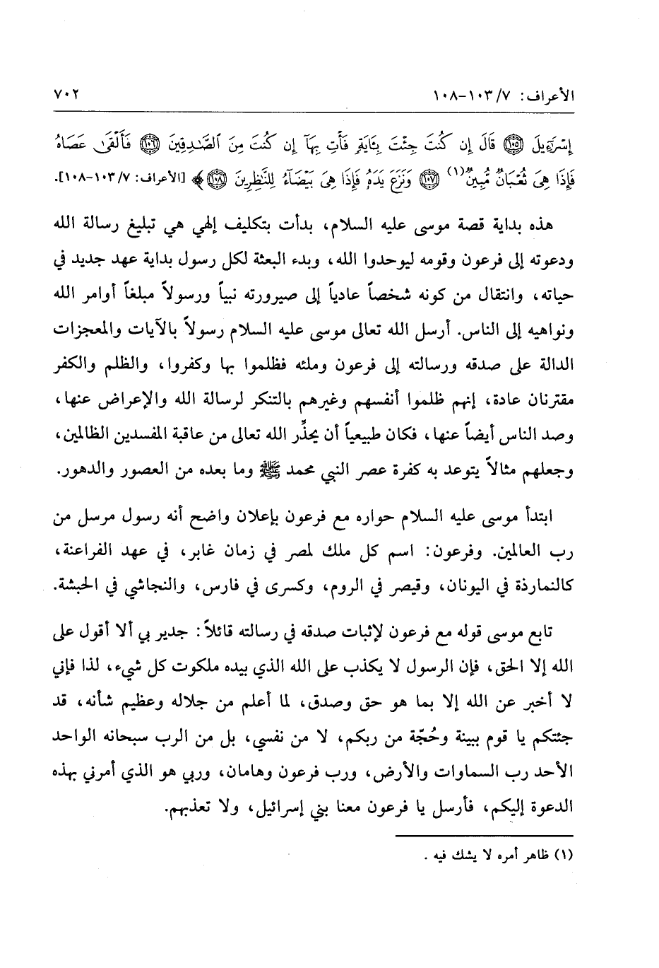 تابع موسى قوله مع فرعون لإثبات صدقه في رسالته قائلا: جدير بي ألا أقول على الله إلا الحق، فإن الرسول لا يكذب على الله الذي بيده ملكوت كل شيء، لذا فإني لا أخبر عن الله إلا بما هو حق وصدق، لما أعلم من جلاله وعظيم شأنه، قد جئتكم يا قوم ببينة وحجّة من ربكم، لا من نفسي، بل من الرب سبحانه الواحد الأحد رب السماوات والأرض، ورب فرعون وهامان، وربي هو الذي أمرني بهذه الدعوة إليكم، فأرسل يا فرعون معنا بني إسرائيل، ولا تعذبهم.