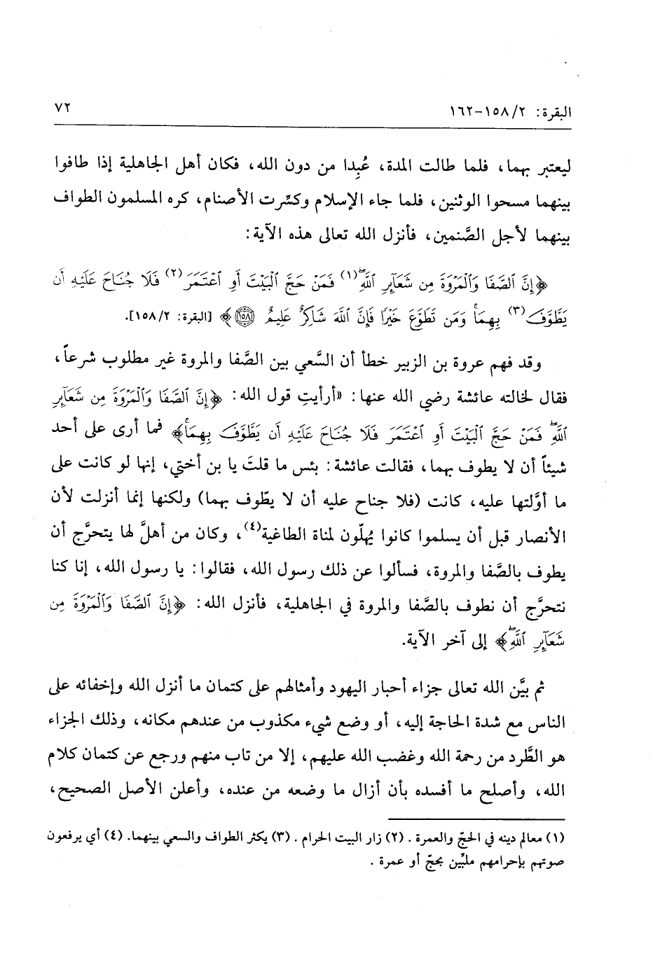 وقد فهم عروة بن الزبير خطأ أن السّعي بين الصّفا والمروة غير مطلوب شرعا، فقال لخالته عائشة رضي الله عنها: «أرأيت قول الله: إِنَّ الصَّفا وَالْمَرْوَةَ مِنْ شَعائِرِ اللَّهِ فَمَنْ حَجَّ الْبَيْتَ أَوِ اعْتَمَرَ فَلا جُناحَ عَلَيْهِ أَنْ يَطَّوَّفَ بِهِما فما أرى على أحد شيئا أن لا يطوف بهما، فقالت عائشة: بئس ما قلت يا بن أختي، إنها لو كانت على ما أوّلتها عليه، كانت (فلا جناح عليه أن لا يطّوف بهما) ولكنها إنما أنزلت لأن الأنصار قبل أن يسلموا كانوا يهلّون لمناة الطاغية «4» ، وكان من أهلّ لها يتحرّج أن يطوف بالصّفا والمروة، فسألوا عن ذلك رسول الله، فقالوا: يا رسول الله، إنا كنا نتحرّج أن نطوف بالصّفا والمروة في الجاهلية، فأنزل الله: إِنَّ الصَّفا وَالْمَرْوَةَ مِنْ شَعائِرِ اللَّهِ إلى آخر الآية.