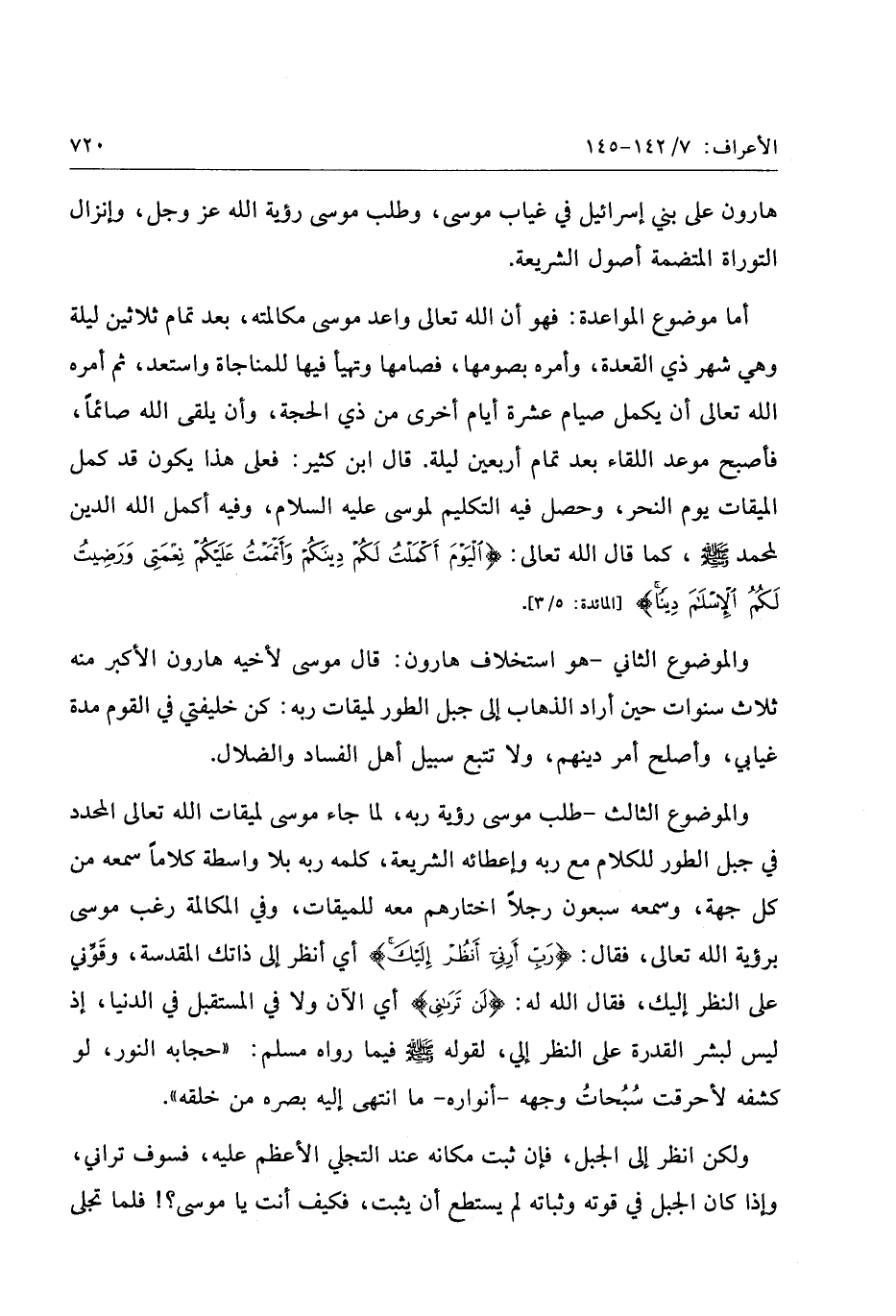 هارون على بني إسرائيل في غياب موسى، وطلب موسى رؤية الله عز وجل، وإنزال التوراة المتضمنة أصول الشريعة.