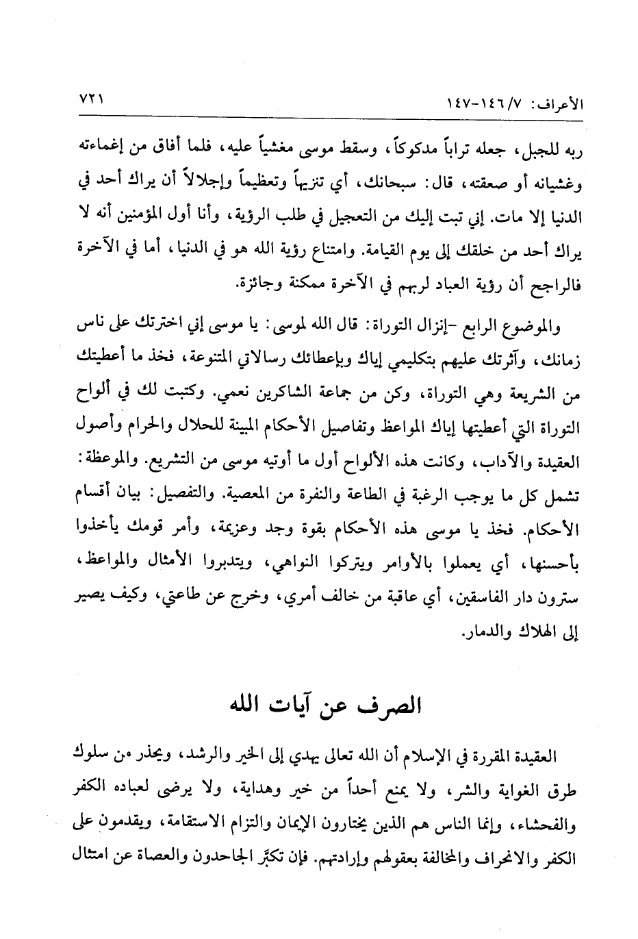 ربه للجبل، جعله ترابا مدكوكا، وسقط موسى مغشيا عليه، فلما أفاق من إغماءته وغشيانه أو صعقته، قال: سبحانك، أي تنزيها وتعظيما وإجلالا أن يراك أحد في الدنيا إلا مات. إني تبت إليك من التعجيل في طلب الرؤية، وأنا أول المؤمنين أنه لا يراك أحد من خلقك إلى يوم القيامة. وامتناع رؤية الله هو في الدنيا، أما في الآخرة فالراجح أن رؤية العباد لربهم في الآخرة ممكنة وجائزة.