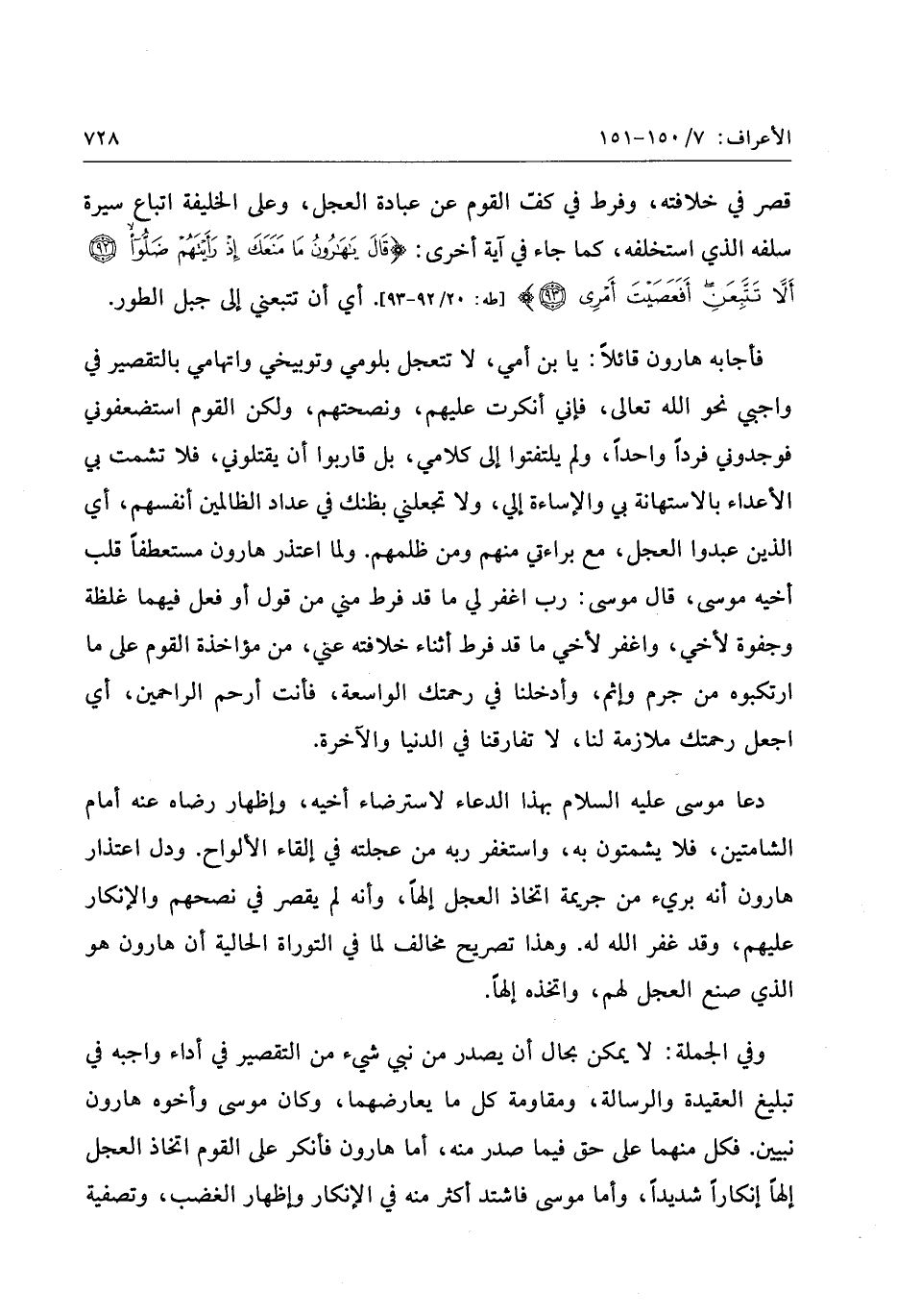 وفي الجملة: لا يمكن بحال أن يصدر من نبي شيء من التقصير في أداء واجبه في تبليغ العقيدة والرسالة، ومقاومة كل ما يعارضهما، وكان موسى وأخوه هارون نبيين. فكل منهما على حق فيما صدر منه، أما هارون فأنكر على القوم اتخاذ العجل إلها إنكارا شديدا، وأما موسى فاشتد أكثر منه في الإنكار وإظهار الغضب، وتصفية