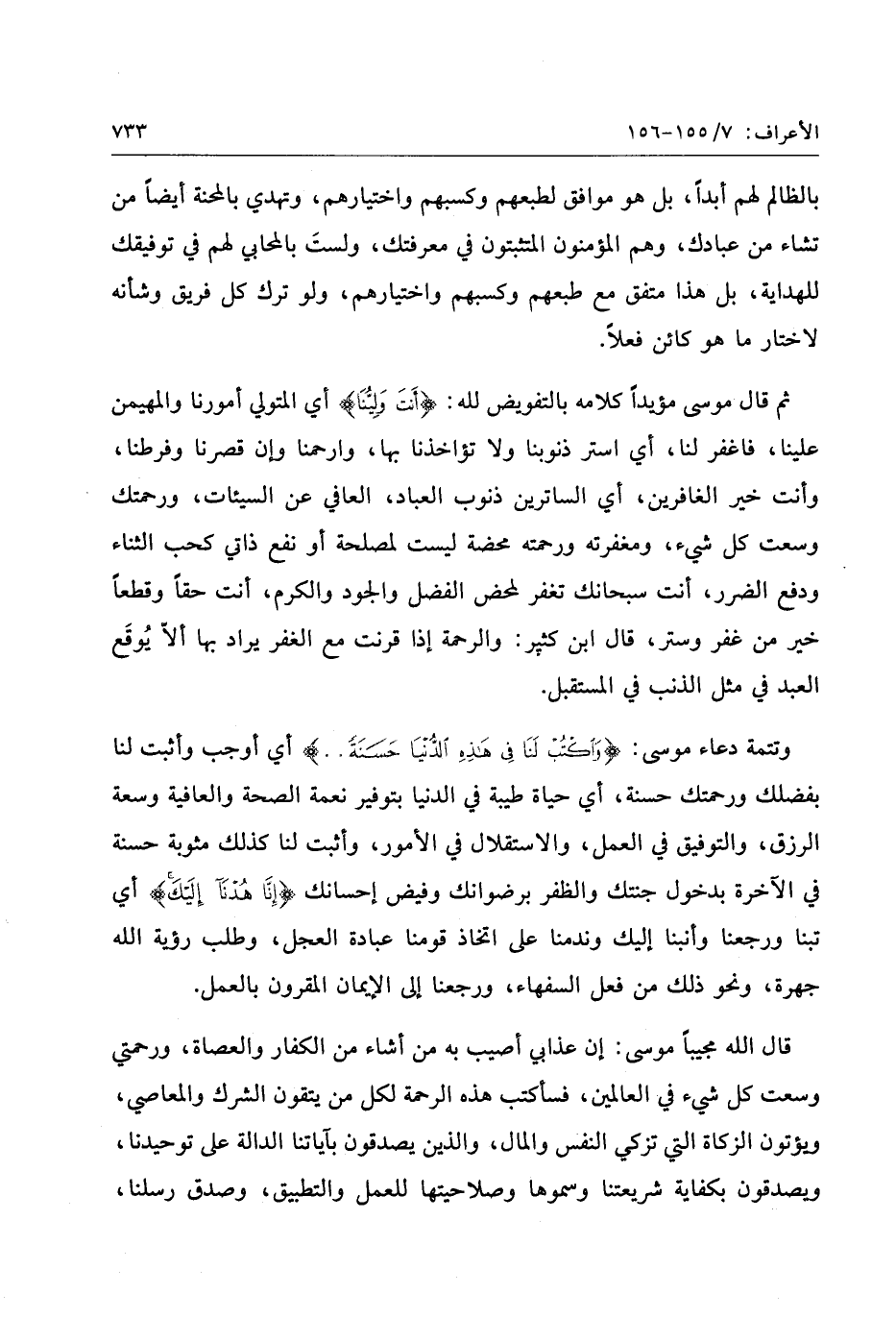 ثم قال موسى مؤيدا كلامه بالتفويض لله: أَنْتَ وَلِيُّنا أي المتولي أمورنا والمهيمن علينا، فاغفر لنا، أي استر ذنوبنا ولا تؤاخذنا بها، وارحمنا وإن قصرنا وفرطنا، وأنت خير الغافرين، أي الساترين ذنوب العباد، العافي عن السيئات، ورحمتك وسعت كل شيء، ومغفرته ورحمته محضة ليست لمصلحة أو نفع ذاتي كحب الثناء ودفع الضرر، أنت سبحانك تغفر لمحض الفضل والجود والكرم، أنت حقا وقطعا خير من غفر وستر، قال ابن كثير: والرحمة إذا قرنت مع الغفر يراد بها ألّا يوقع العبد في مثل الذنب في المستقبل.