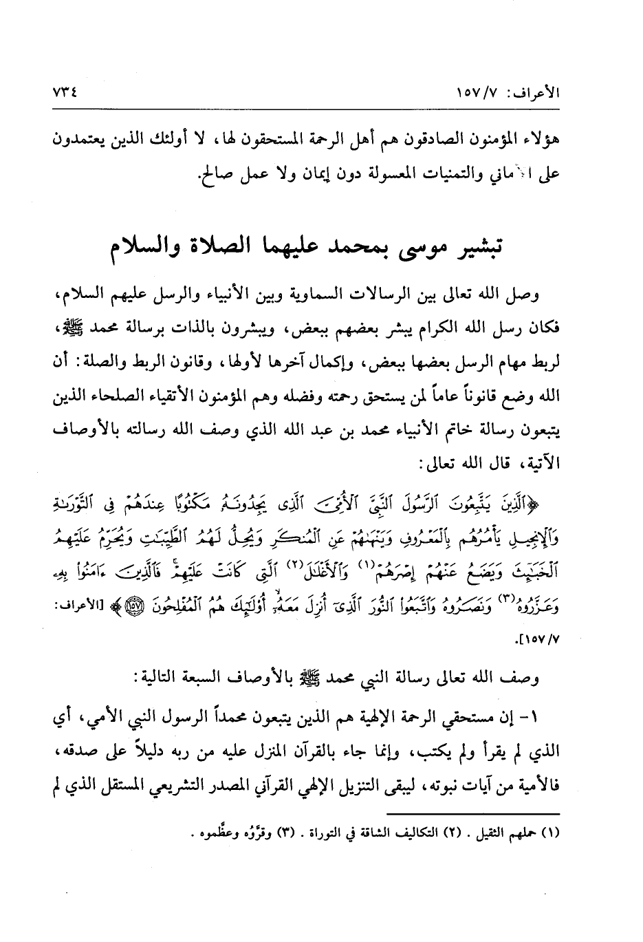 1- إن مستحقي الرحمة الإلهية هم الذين يتبعون محمدا الرسول النبي الأمي، أي الذي لم يقرأ ولم يكتب، وإنما جاء بالقرآن المنزل عليه من ربه دليلا على صدقه، فالأمية من آيات نبوته، ليبقى التنزيل الإلهي القرآني المصدر التشريعي المستقل الذي لم