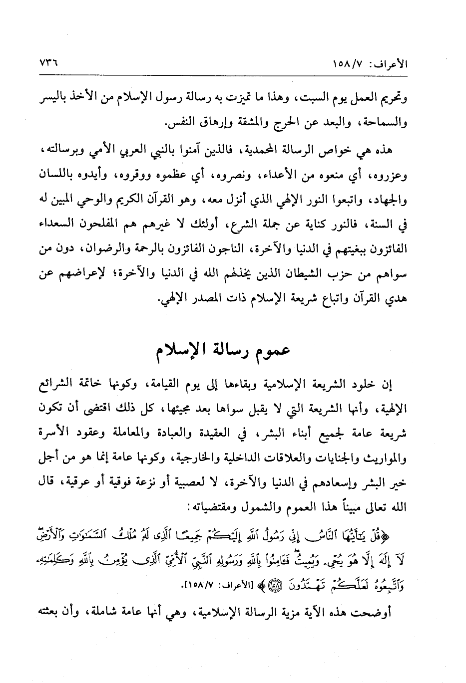 قُلْ يا أَيُّهَا النَّاسُ إِنِّي رَسُولُ اللَّهِ إِلَيْكُمْ جَمِيعاً الَّذِي لَهُ مُلْكُ السَّماواتِ وَالْأَرْضِ لا إِلهَ إِلاَّ هُوَ يُحيِي وَيُمِيتُ فَآمِنُوا بِاللَّهِ وَرَسُولِهِ النَّبِيِّ الْأُمِّيِّ الَّذِي يُؤْمِنُ بِاللَّهِ وَكَلِماتِهِ وَاتَّبِعُوهُ لَعَلَّكُمْ تَهْتَدُونَ (158)