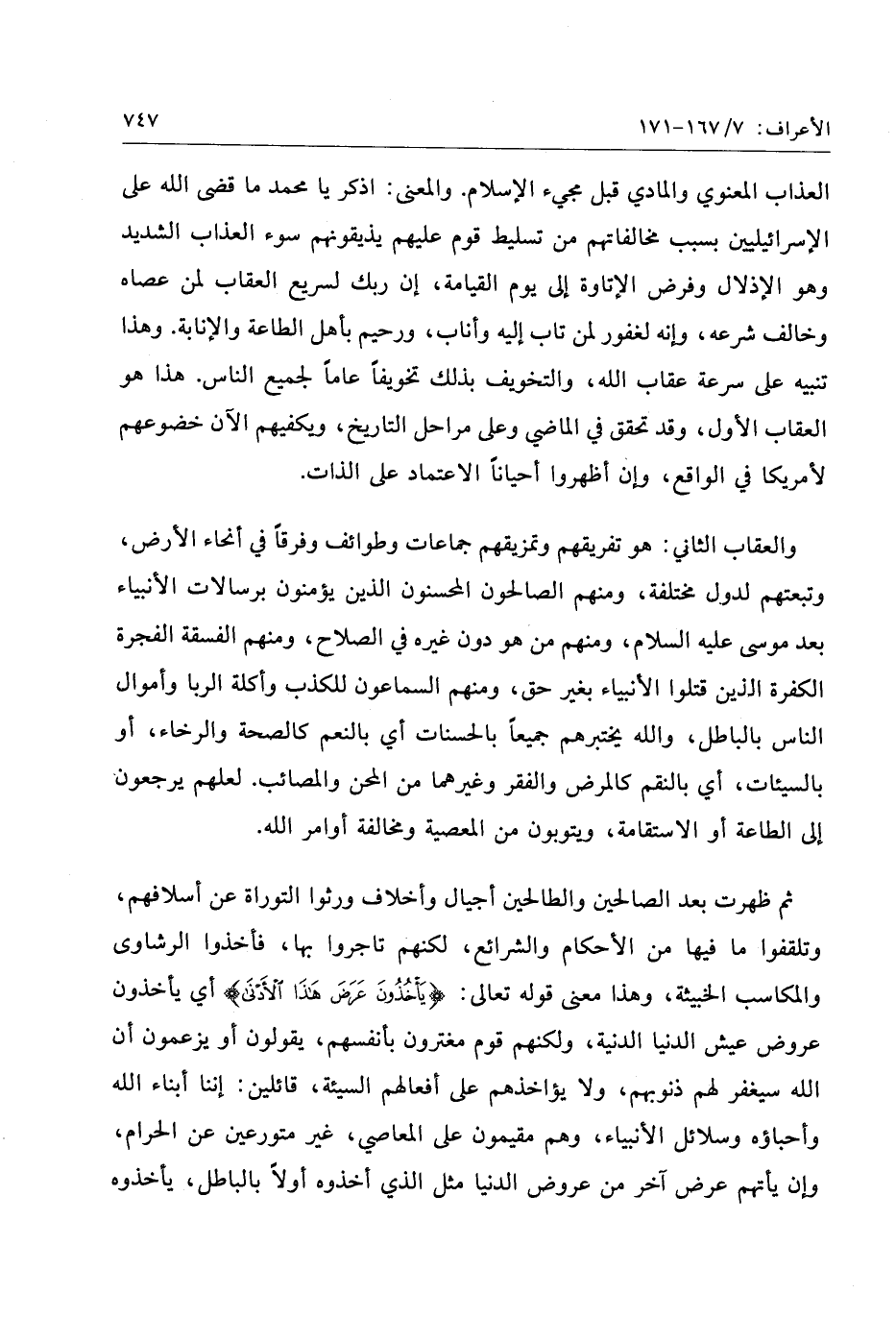 العذاب المعنوي والمادي قبل مجيء الإسلام. والمعنى: اذكر يا محمد ما قضى الله على الإسرائيليين بسبب مخالفاتهم من تسليط قوم عليهم يذيقونهم سوء العذاب الشديد وهو الإذلال وفرض الإتاوة إلى يوم القيامة، إن ربك لسريع العقاب لمن عصاه وخالف شرعه، وإنه لغفور لمن تاب إليه وأناب، ورحيم بأهل الطاعة والإنابة. وهذا تنبيه على سرعة عقاب الله، والتخويف بذلك تخويفا عاما لجميع الناس. هذا هو العقاب الأول، وقد تحقق في الماضي وعلى مراحل التاريخ، ويكفيهم الآن خضوعهم لإمريكا في الواقع، وإن أظهروا أحيانا الاعتماد على الذات.