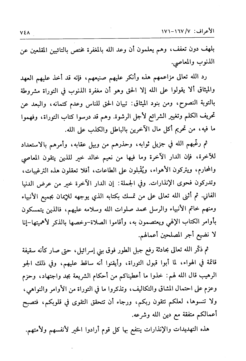 ثم رغّبهم الله في جزيل ثوابه، وحذرهم من وبيل عقابه، وأمرهم بالاستعداد للآخرة، فإن الدار الآخرة وما فيها من نعيم خالد خير للذين يتقون المعاصي والمحارم، ويتركون الأهواء، ويقبلون على الطاعات، أفلا تعقلون هذه الترغيبات، وتدركون فحوى الإنذارات. وفي الجملة: إن الدار الآخرة خير من عرض الدنيا الفاني. ثم أثنى الله تعالى على من تمسك بكتابه الذي يوجهه للإيمان بجميع الأنبياء ومنهم خاتم الأنبياء والرسل محمد صلوات الله وسلامه عليهم، فالذين يتمسكون بأوامر الكتاب الإلهي ويعتصمون به، وأقاموا الصلاة- وخصها بالذكر لأهميتها- إنا لا نضيع أجر المصلحين أعمالهم.