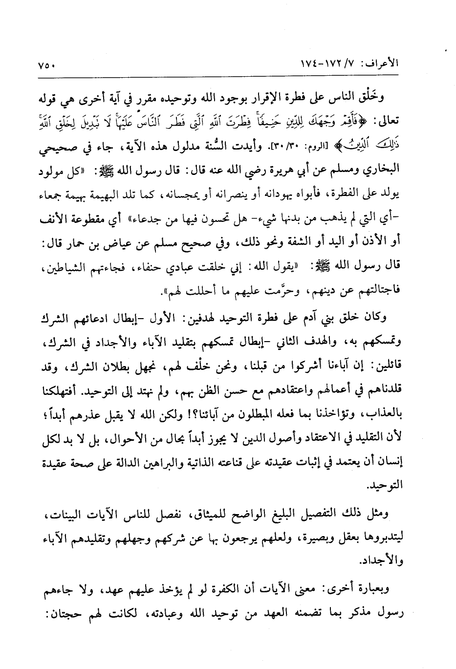 وكان خلق بني آدم على فطرة التوحيد لهدفين: الأول- إبطال ادعائهم الشرك وتمسكهم به، والهدف الثاني- إبطال تمسكهم بتقليد الآباء والأجداد في الشرك، قائلين: إن آباءنا أشركوا من قبلنا، ونحن خلف لهم، نجهل بطلان الشرك، وقد قلدناهم في أعمالهم واعتقادهم مع حسن الظن بهم، ولم نهتد إلى التوحيد. أفتهلكنا بالعذاب، وتؤاخذنا بما فعله المبطلون من آبائنا؟! ولكن الله لا يقبل عذرهم أبدا لأن التقليد في الاعتقاد وأصول الدين لا يجوز أبدا بحال من الأحوال، بل لا بد لكل إنسان أن يعتمد في إثبات عقيدته على قناعته الذاتية والبراهين الدالة على صحة عقيدة التوحيد.