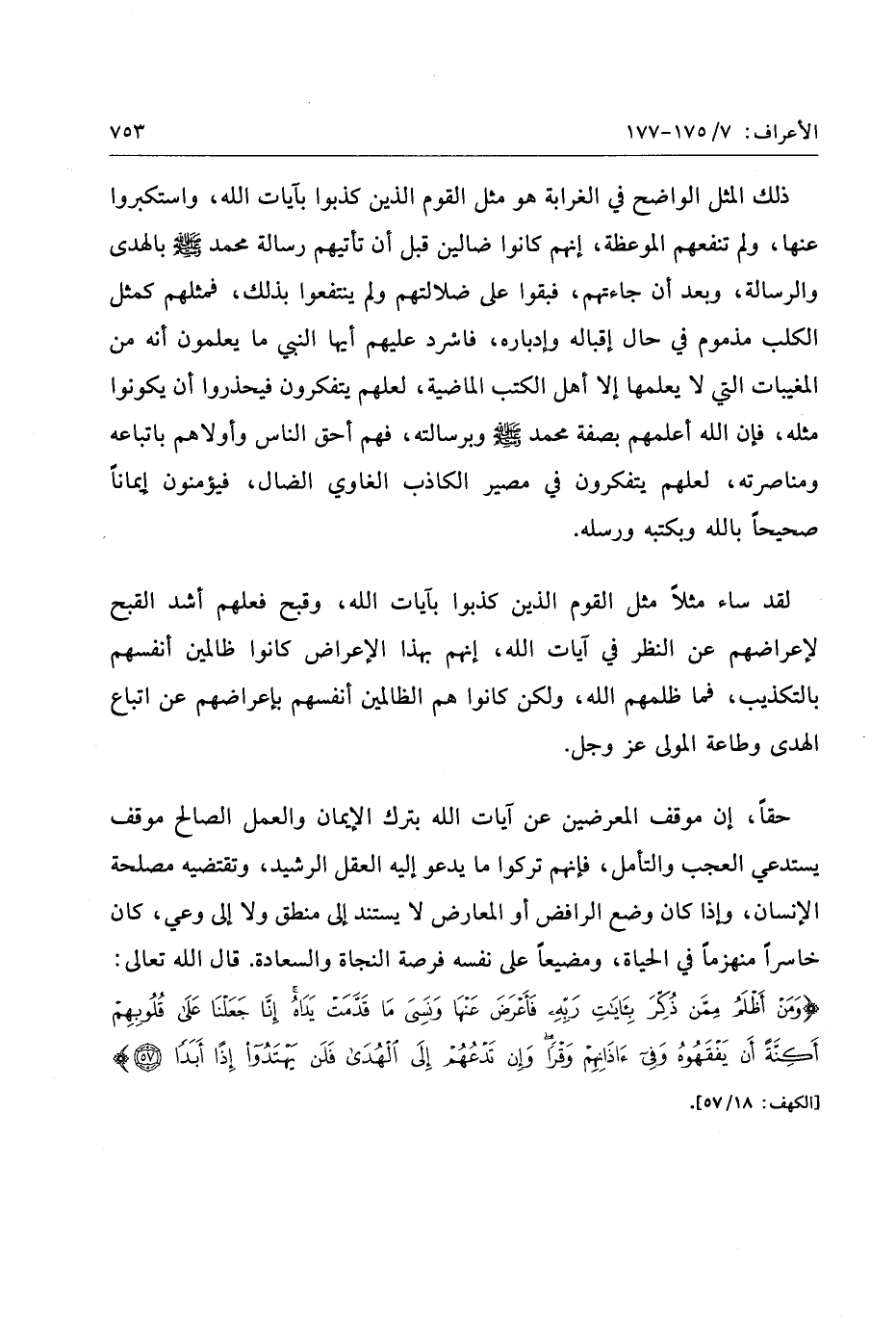 ذلك المثل الواضح في الغرابة هو مثل القوم الذين كذبوا بآيات الله، واستكبروا عنها، ولم تنفعهم الموعظة، إنهم كانوا ضالين قبل أن تأتيهم رسالة محمد صلّى الله عليه وسلّم بالهدى والرسالة، وبعد أن جاءتهم، فبقوا على ضلالتهم ولم ينتفعوا بذلك، فمثلهم كمثل الكلب مذموم في حال إقباله وإدباره، فاسرد عليهم أيها النبي ما يعلمون أنه من المغيبات التي لا يعلمها إلا أهل الكتب الماضية، لعلهم يتفكرون فيحذروا أن يكونوا مثله، فإن الله أعلمهم بصفة محمد صلّى الله عليه وسلّم وبرسالته، فهم أحق الناس وأولاهم باتباعه ومناصرته، لعلهم يتفكرون في مصير الكاذب الغاوي الضال، فيؤمنون إيمانا صحيحا بالله وبكتبه ورسله.