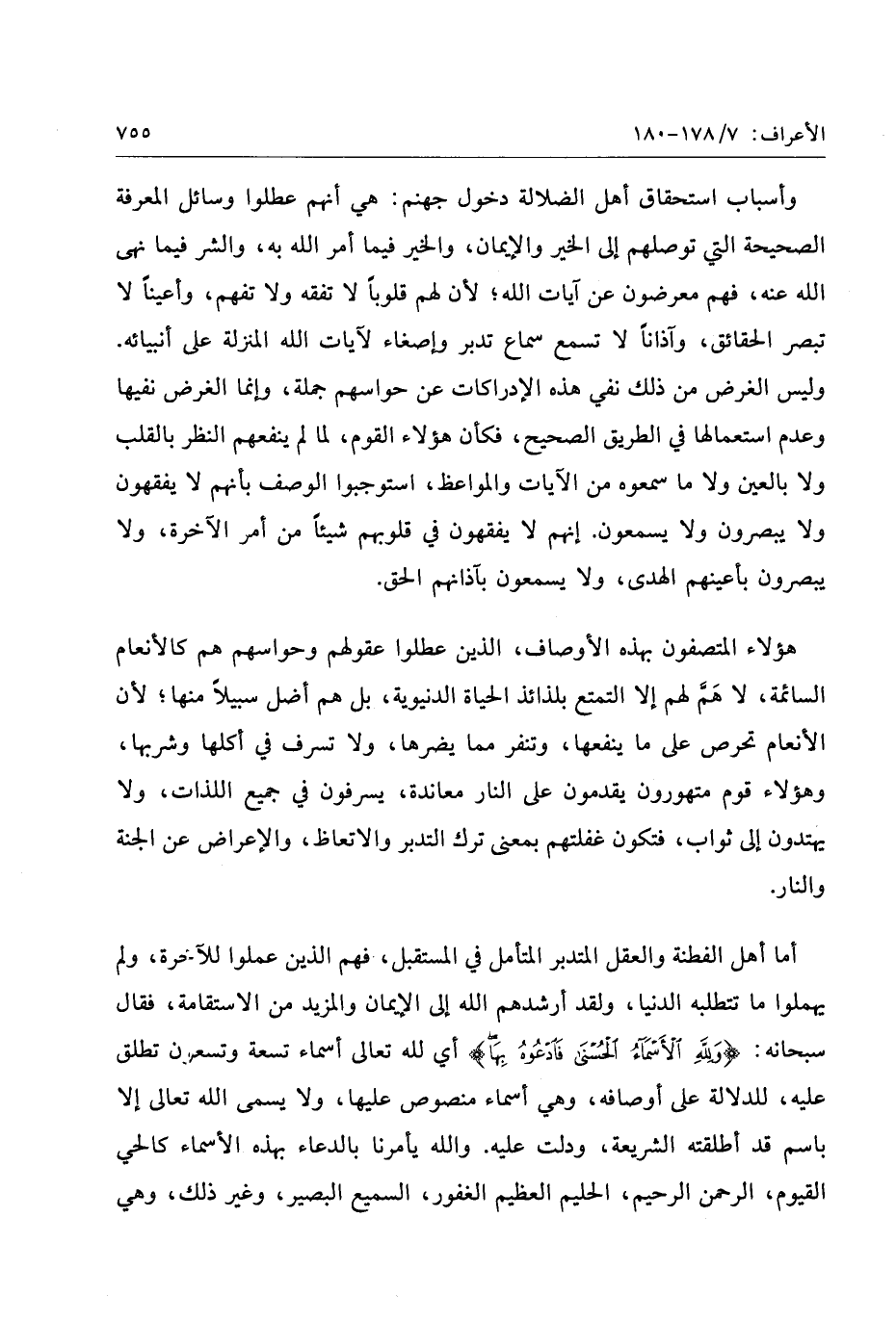 وأسباب استحقاق أهل الضلالة دخول جهنم: هي أنهم عطلوا وسائل المعرفة الصحيحة التي توصلهم إلى الخير والإيمان، والخير فيما أمر الله به، والشر فيما نهى الله عنه، فهم معرضون عن آيات الله لأن لهم قلوبا لا تفقه ولا تفهم، وأعينا لا تبصر الحقائق، وآذانا لا تسمع سماع تدبر وإصغاء لآيات الله المنزلة على أنبيائه.