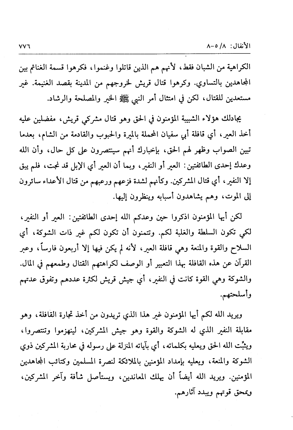 لكن أيها المؤمنون اذكروا حين وعدكم الله إحدى الطائفتين: العير أو النفير، لكي تكون السلطة والغلبة لكم. وتتمنون أن تكون لكم غير ذات الشوكة، أي السلاح والقوة والمنعة وهي قافلة العير، لأنه لم يكن فيها إلا أربعون فارسا، وعبر القرآن عن هذه القافلة بهذا التعبير أو الوصف لكراهتهم القتال وطمعهم في المال.