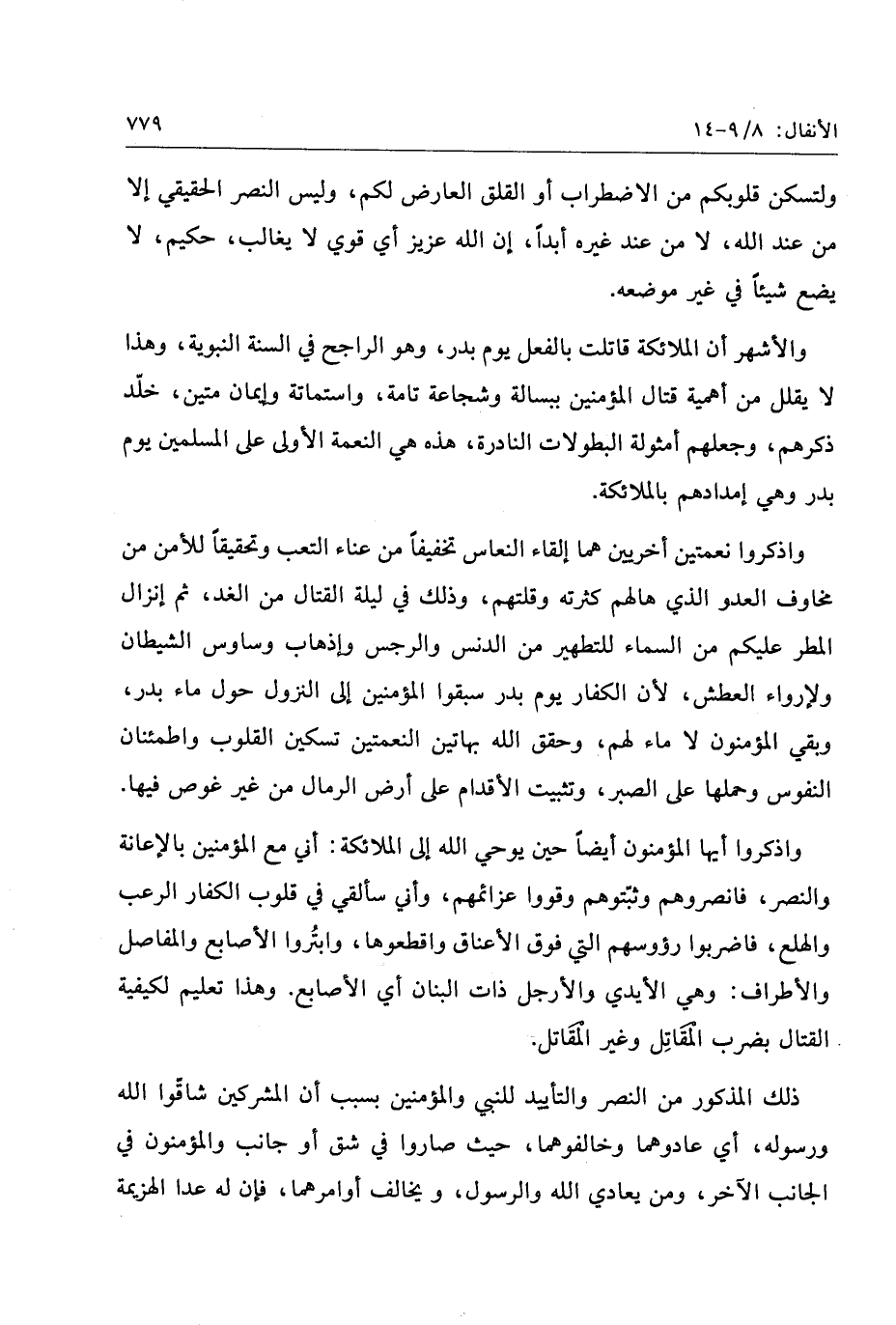 ولتسكن قلوبكم من الاضطراب أو القلق العارض لكم، وليس النصر الحقيقي إلا من عند الله، لا من عند غيره أبدا، إن الله عزيز أي قوي لا يغالب، حكيم، لا يضع شيئا في غير موضعه.