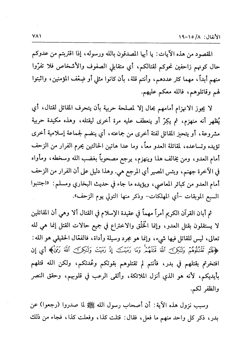 فَلَمْ تَقْتُلُوهُمْ وَلكِنَّ اللَّهَ قَتَلَهُمْ وَما رَمَيْتَ إِذْ رَمَيْتَ وَلكِنَّ اللَّهَ رَمى أي إن افتخرتم بقتلهم في بدر، فأنتم لم تقتلوهم بقوتكم وعدتكم، ولكن الله قتلهم بأيديكم، لأنه هو الذي أنزل الملائكة، وألقى الرعب في قلوبهم، وحقق النصر والظفر لكم.