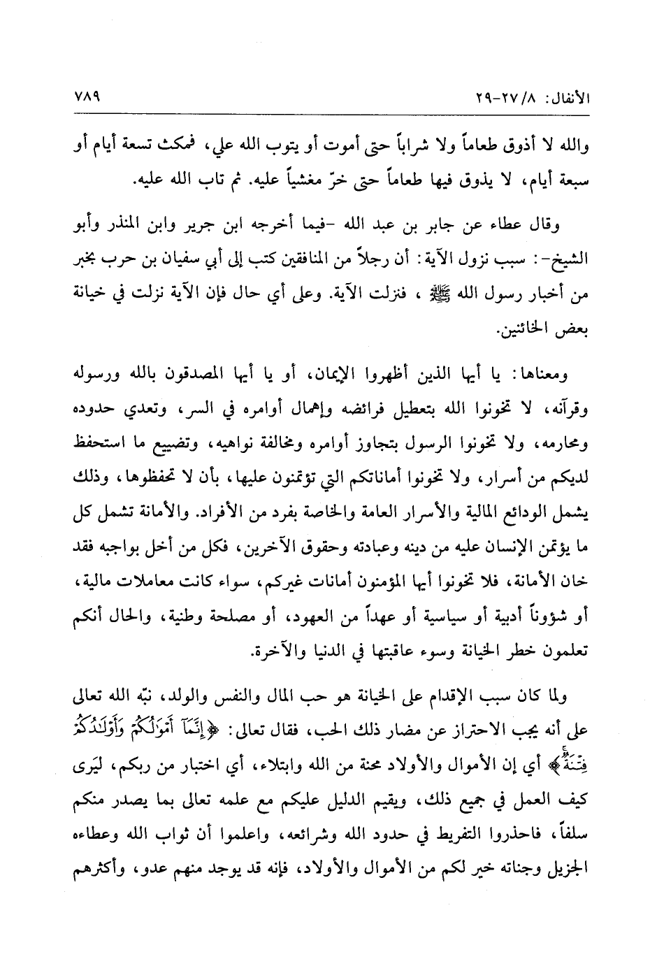 ومعناها: يا أيها الذين أظهروا الإيمان، أو يا أيها المصدقون بالله ورسوله وقرآنه، لا تخونوا الله بتعطيل فرائضه وإهمال أوامره في السر، وتعدي حدوده ومحارمه، ولا تخونوا الرسول بتجاوز أوامره ومخالفة نواهيه، وتضييع ما استحفظ لديكم من أسرار، ولا تخونوا أماناتكم التي تؤتمنون عليها، بأن لا تحفظوها، وذلك يشمل الودائع المالية والأسرار العامة والخاصة بفرد من الأفراد. والأمانة تشمل كل ما يؤتمن الإنسان عليه من دينه وعبادته وحقوق الآخرين، فكل من أخل بواجبه فقد خان الأمانة، فلا تخونوا أيها المؤمنون أمانات غيركم، سواء كانت معاملات مالية، أو شؤونا أدبية أو سياسية أو عهدا من العهود، أو مصلحة وطنية، والحال أنكم تعلمون خطر الخيانة وسوء عاقبتها في الدنيا والآخرة.