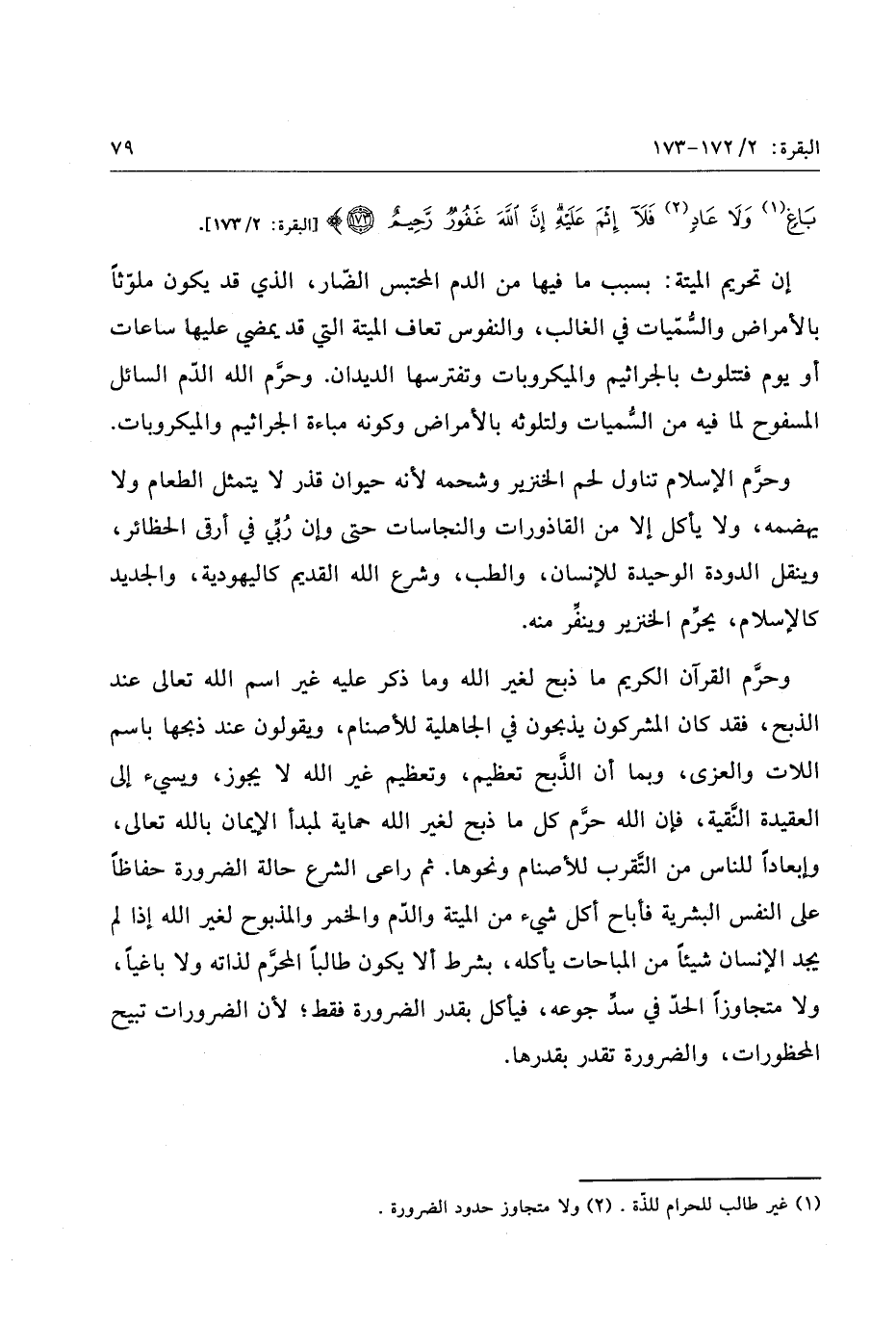 وحرّم القرآن الكريم ما ذبح لغير الله وما ذكر عليه غير اسم الله تعالى عند الذبح، فقد كان المشركون يذبحون في الجاهلية للأصنام، ويقولون عند ذبحها باسم اللات والعزى، وبما أن الذّبح تعظيم، وتعظيم غير الله لا يجوز، ويسيء إلى العقيدة النّقية، فإن الله حرّم كل ما ذبح لغير الله حماية لمبدأ الإيمان بالله تعالى، وإبعادا للناس من التّقرب للأصنام ونحوها. ثم راعى الشرع حالة الضرورة حفاظا على النفس البشرية فأباح أكل شيء من الميتة والدّم والخمر والمذبوح لغير الله إذا لم يجد الإنسان شيئا من المباحات يأكله، بشرط ألا يكون طالبا المحرّم لذاته ولا باغيا، ولا متجاوزا الحدّ في سدّ جوعه، فيأكل بقدر الضرورة فقط لأن الضرورات تبيح المحظورات، والضرورة تقدر بقدرها.