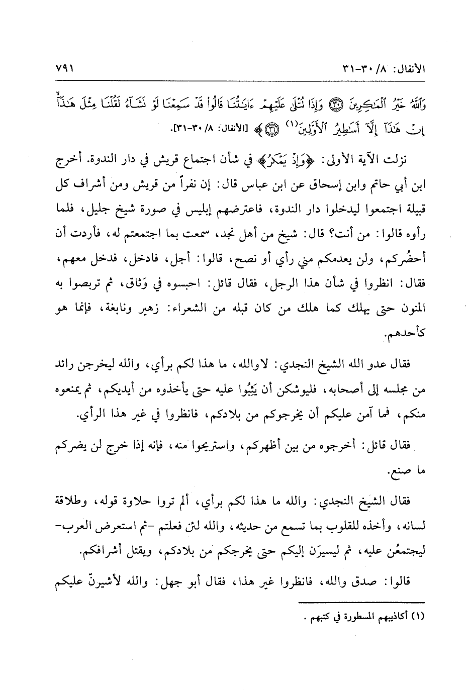 أخرج ابن أبي حاتم وابن إسحاق عن ابن عباس قال: إن نفرا من قريش ومن أشراف كل قبيلة اجتمعوا ليدخلوا دار الندوة، فاعترضهم إبليس في صورة شيخ جليل، فلما رأوه قالوا: من أنت؟ قال: شيخ من أهل نجد، سمعت بما اجتمعتم له، فأردت أن أحضركم، ولن يعدمكم مني رأي أو نصح، قالوا: أجل، فادخل، فدخل معهم، فقال: انظروا في شأن هذا الرجل، فقال قائل: احبسوه في وثاق، ثم تربصوا به المنون حتى يهلك كما هلك من كان قبله من الشعراء: زهير ونابغة، فإنما هو كأحدهم.