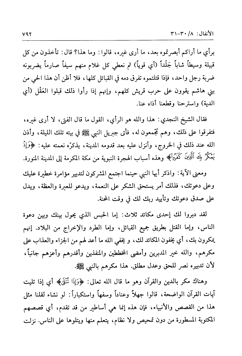 فقال الشيخ النجدي: هذا والله هو الرأي، القول ما قال الفتى، لا أرى غيره، فتفرقوا على ذلك، وهم مجمعون له، فأتى جبريل النبي صلّى الله عليه وسلّم في بيته تلك الليلة، وأذن الله عند ذلك في الخروج، وأنزل عليه بعد قدومه المدينة، يذكّره نعمته عليه: وَإِذْ يَمْكُرُ بِكَ الَّذِينَ كَفَرُوا