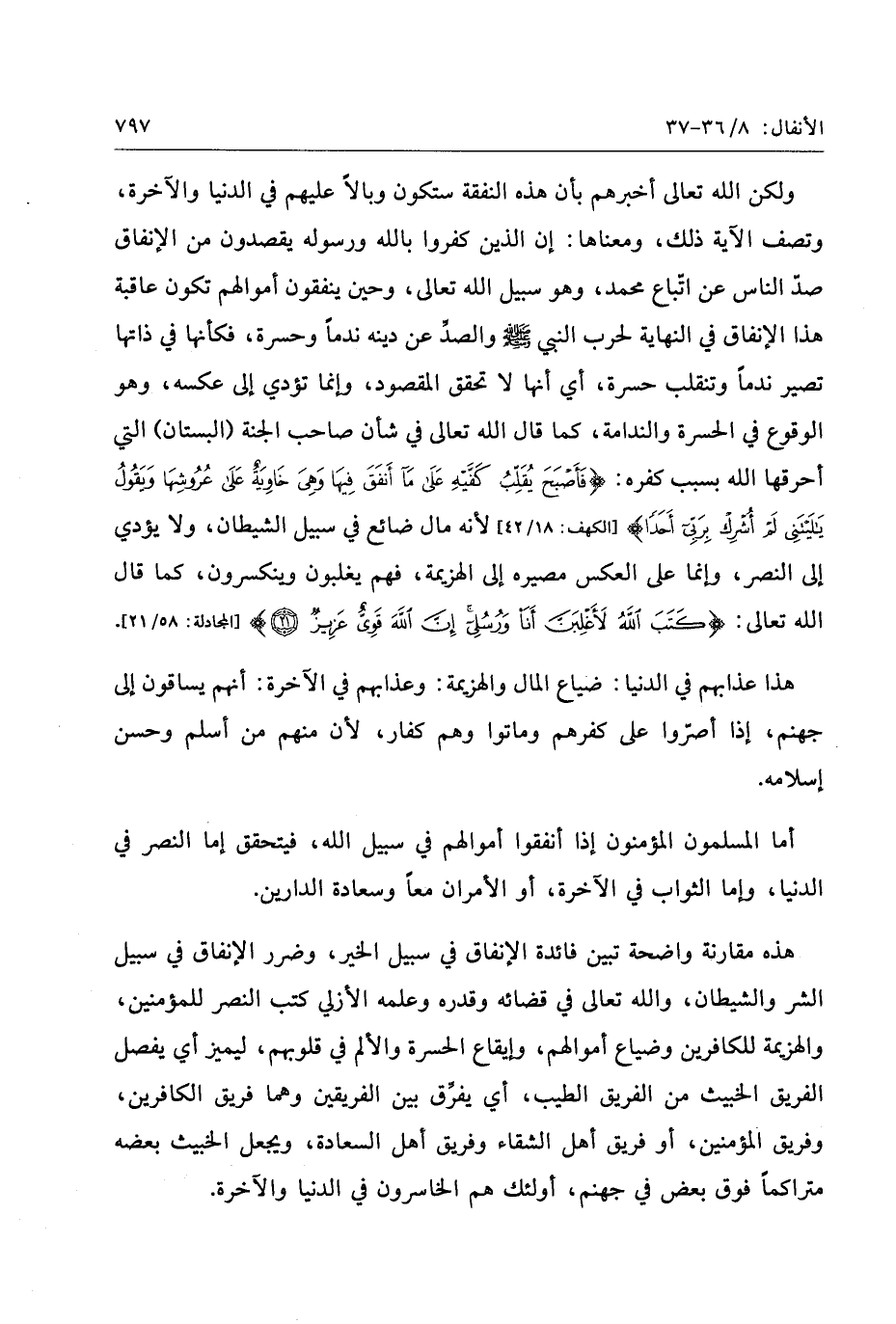 ولكن الله تعالى أخبرهم بأن هذه النفقة ستكون وبالا عليهم في الدنيا والآخرة، وتصف الآية ذلك، ومعناها: إن الذين كفروا بالله ورسوله يقصدون من الإنفاق صدّ الناس عن اتّباع محمد، وهو سبيل الله تعالى، وحين ينفقون أموالهم تكون عاقبة هذا الإنفاق في النهاية لحرب النبي صلّى الله عليه وسلّم والصدّ عن دينه ندما وحسرة، فكأنها في ذاتها تصير ندما وتنقلب حسرة، أي أنها لا تحقق المقصود، وإنما تؤدي إلى عكسه، وهو الوقوع في الحسرة والندامة، كما قال الله تعالى في شأن صاحب الجنة (البستان) التي أحرقها الله بسبب كفره: فَأَصْبَحَ يُقَلِّبُ كَفَّيْهِ عَلى ما أَنْفَقَ فِيها وَهِيَ خاوِيَةٌ عَلى عُرُوشِها وَيَقُولُ يا لَيْتَنِي لَمْ أُشْرِكْ بِرَبِّي أَحَداً [الكهف: 18/ 42] لأنه مال ضائع في سبيل الشيطان، ولا يؤدي إلى النصر، وإنما على العكس مصيره إلى الهزيمة، فهم يغلبون وينكسرون، كما قال الله تعالى: كَتَبَ اللَّهُ لَأَغْلِبَنَّ أَنَا وَرُسُلِي إِنَّ اللَّهَ قَوِيٌّ عَزِيزٌ (21) [المجادلة: 58/ 21] .