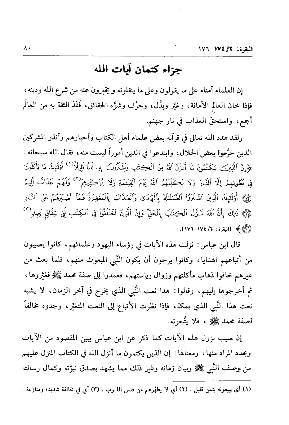 إِنَّ الَّذِينَ يَكْتُمُونَ ما أَنْزَلَ اللَّهُ مِنَ الْكِتابِ وَيَشْتَرُونَ بِهِ ثَمَناً قَلِيلاً أُولئِكَ ما يَأْكُلُونَ فِي بُطُونِهِمْ إِلاَّ النَّارَ وَلا يُكَلِّمُهُمُ اللَّهُ يَوْمَ الْقِيامَةِ وَلا يُزَكِّيهِمْ وَلَهُمْ عَذابٌ أَلِيمٌ (174) أُولئِكَ الَّذِينَ اشْتَرَوُا الضَّلالَةَ بِالْهُدى وَالْعَذابَ بِالْمَغْفِرَةِ فَما أَصْبَرَهُمْ عَلَى النَّارِ (175) ذلِكَ بِأَنَّ اللَّهَ نَزَّلَ الْكِتابَ بِالْحَقِّ وَإِنَّ الَّذِينَ اخْتَلَفُوا فِي الْكِتابِ لَفِي شِقاقٍ بَعِيدٍ (176)