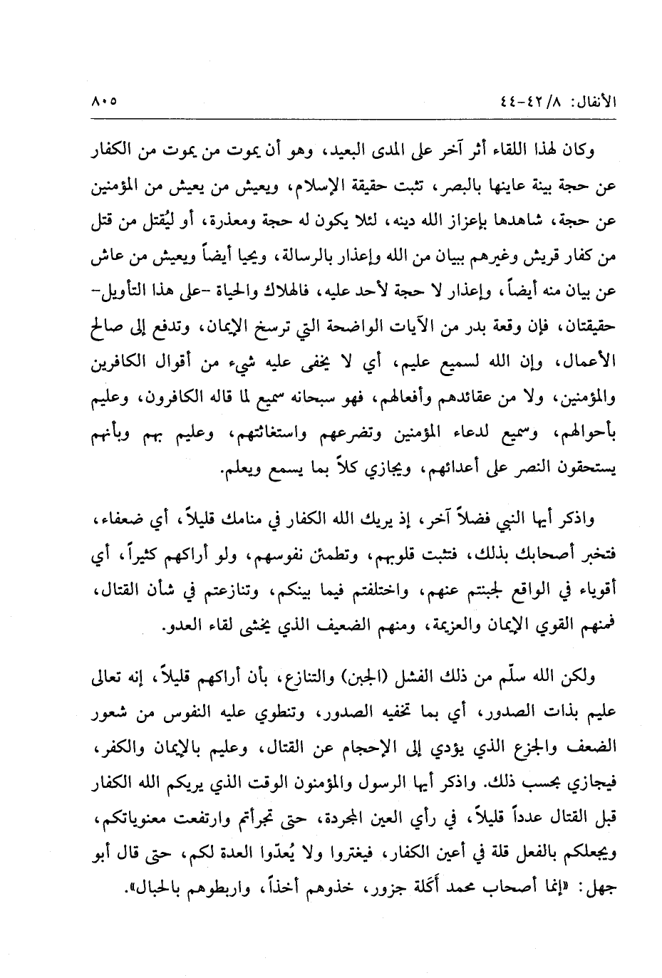ولكن الله سلّم من ذلك الفشل (الجبن) والتنازع، بأن أراكهم قليلا، إنه تعالى عليم بذات الصدور، أي بما تخفيه الصدور، وتنطوي عليه النفوس من شعور الضعف والجزع الذي يؤدي إلى الإحجام عن القتال، وعليم بالإيمان والكفر، فيجازي بحسب ذلك. واذكر أيها الرسول والمؤمنون الوقت الذي يريكم الله الكفار قبل القتال عددا قليلا، في رأي العين المجردة، حتى تجرأتم وارتفعت معنوياتكم، ويجعلكم بالفعل قلة في أعين الكفار، فيغتروا ولا يعدّوا العدة لكم، حتى قال أبو جهل: «إنما أصحاب محمد أكلة جزور، خذوهم أخذا، واربطوهم بالحبال» .