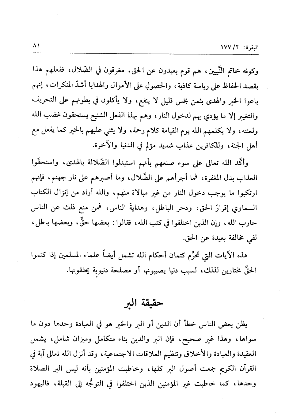 وكونه خاتم النّبيين، هم قوم بعيدون عن الحق، مغرقون في الضّلال، ففعلهم هذا بقصد الحفاظ على رياسة كاذبة، والحصول على الأموال والهدايا أشدّ المنكرات، إنهم باعوا الخير والهدى بثمن بخس قليل لا ينفع، ولا يأكلون في بطونهم على التحريف والتغيير إلا ما يؤدي بهم لدخول النار، وهم بهذا الفعل الشنيع يستحقون غضب الله ولعنته، ولا يكلمهم الله يوم القيامة كلام رحمة، ولا يثني عليهم بالخير كما يفعل مع أهل الجنة، وللكافرين عذاب شديد مؤلم في الدنيا والآخرة.