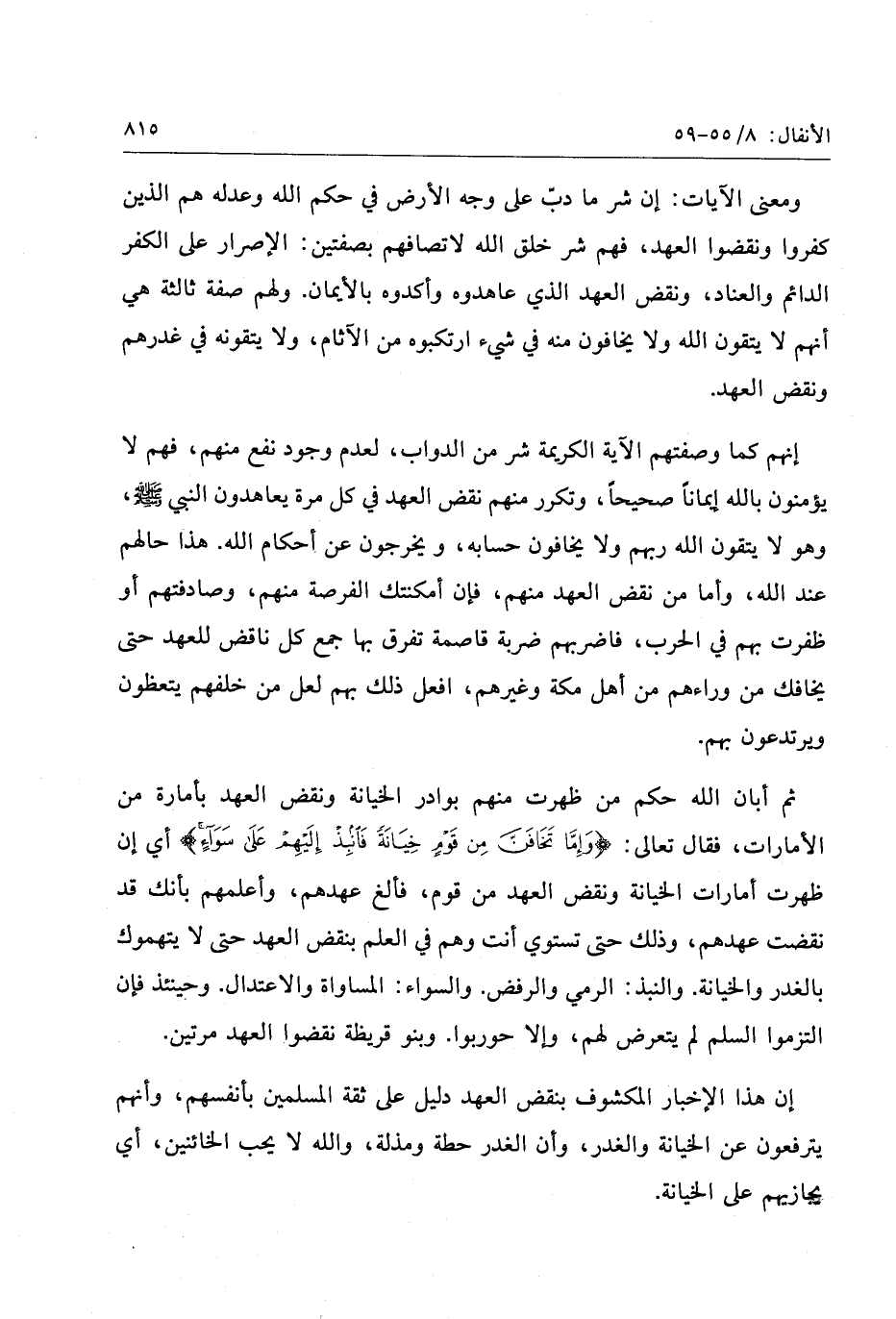 ومعنى الآيات: إن شر ما دبّ على وجه الأرض في حكم الله وعدله هم الذين كفروا ونقضوا العهد، فهم شر خلق الله لا تصافهم بصفتين: الإصرار على الكفر الدائم والعناد، ونقض العهد الذي عاهدوه وأكدوه بالأيمان. ولهم صفة ثالثة هي أنهم لا يتقون الله ولا يخافون منه في شيء ارتكبوه من الآثام، ولا يتقونه في غدرهم ونقض العهد.