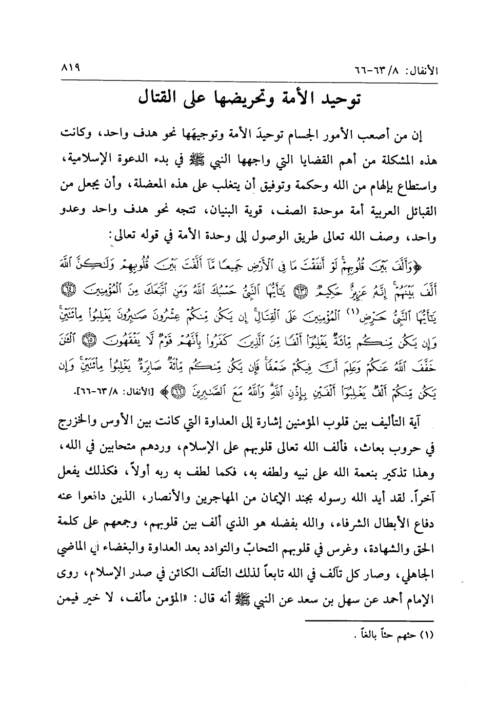 وَأَلَّفَ بَيْنَ قُلُوبِهِمْ لَوْ أَنْفَقْتَ ما فِي الْأَرْضِ جَمِيعاً ما أَلَّفْتَ بَيْنَ قُلُوبِهِمْ وَلكِنَّ اللَّهَ أَلَّفَ بَيْنَهُمْ إِنَّهُ عَزِيزٌ حَكِيمٌ (63) يا أَيُّهَا النَّبِيُّ حَسْبُكَ اللَّهُ وَمَنِ اتَّبَعَكَ مِنَ الْمُؤْمِنِينَ (64) يا أَيُّهَا النَّبِيُّ حَرِّضِ الْمُؤْمِنِينَ عَلَى الْقِتالِ إِنْ يَكُنْ مِنْكُمْ عِشْرُونَ صابِرُونَ يَغْلِبُوا مِائَتَيْنِ وَإِنْ يَكُنْ مِنْكُمْ مِائَةٌ يَغْلِبُوا أَلْفاً مِنَ الَّذِينَ كَفَرُوا بِأَنَّهُمْ قَوْمٌ لا يَفْقَهُونَ (65) الْآنَ خَفَّفَ اللَّهُ عَنْكُمْ وَعَلِمَ أَنَّ فِيكُمْ ضَعْفاً فَإِنْ يَكُنْ مِنْكُمْ مِائَةٌ صابِرَةٌ يَغْلِبُوا مِائَتَيْنِ وَإِنْ يَكُنْ مِنْكُمْ أَلْفٌ يَغْلِبُوا أَلْفَيْنِ بِإِذْنِ اللَّهِ وَاللَّهُ مَعَ الصَّابِرِينَ (66)