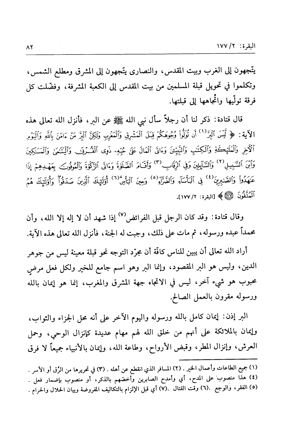 لَيْسَ الْبِرَّ أَنْ تُوَلُّوا وُجُوهَكُمْ قِبَلَ الْمَشْرِقِ وَالْمَغْرِبِ وَلكِنَّ الْبِرَّ مَنْ آمَنَ بِاللَّهِ وَالْيَوْمِ الْآخِرِ وَالْمَلائِكَةِ وَالْكِتابِ وَالنَّبِيِّينَ وَآتَى الْمالَ عَلى حُبِّهِ ذَوِي الْقُرْبى وَالْيَتامى وَالْمَساكِينَ وَابْنَ السَّبِيلِ وَالسَّائِلِينَ وَفِي الرِّقابِ وَأَقامَ الصَّلاةَ وَآتَى الزَّكاةَ وَالْمُوفُونَ بِعَهْدِهِمْ إِذا عاهَدُوا وَالصَّابِرِينَ فِي الْبَأْساءِ وَالضَّرَّاءِ وَحِينَ الْبَأْسِ أُولئِكَ الَّذِينَ صَدَقُوا وَأُولئِكَ هُمُ الْمُتَّقُونَ (177)