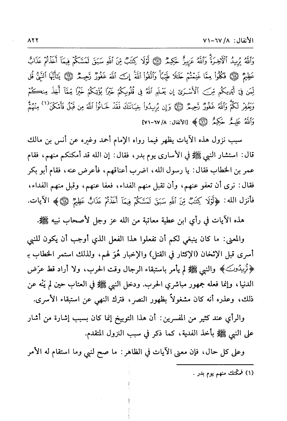 «1» [الأنفال: 8/ 67- 71] سبب نزول هذه الآيات يظهر فيما