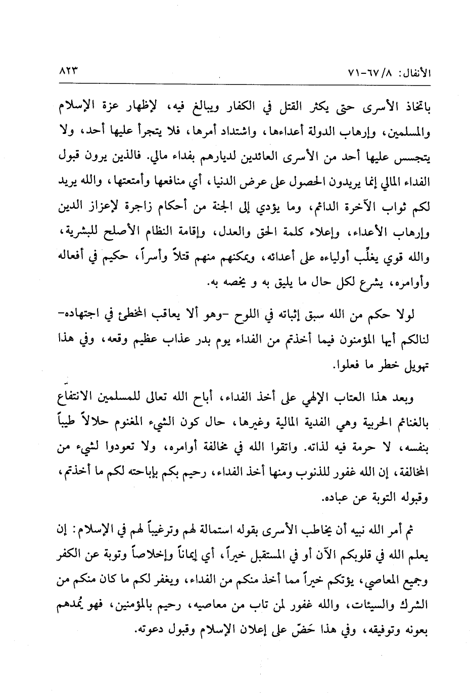 باتخاذ الأسرى حتى يكثر القتل في الكفار ويبالغ فيه، لإظهار عزة الإسلام والمسلمين، وإرهاب الدولة أعداءها، واشتداد أمرها، فلا يتجرأ عليها أحد، ولا يتجسس عليها أحد من الأسرى العائدين لديارهم بفداء مالي. فالذين يرون قبول الفداء المالي إنما يريدون الحصول على عرض الدنيا، أي منافعها وأمتعتها، والله يريد لكم ثواب الآخرة الدائم، وما يؤدي إلى الجنة من أحكام زاجرة لإعزاز الدين وإرهاب الأعداء، وإعلاء كلمة الحق والعدل، وإقامة النظام الأصلح للبشرية، والله قوي يغلّب أولياءه على أعدائه، ويمكنهم منهم قتلا وأسرا، حكيم في أفعاله وأوامره، يشرع لكل حال ما يليق به ويخصه به.
