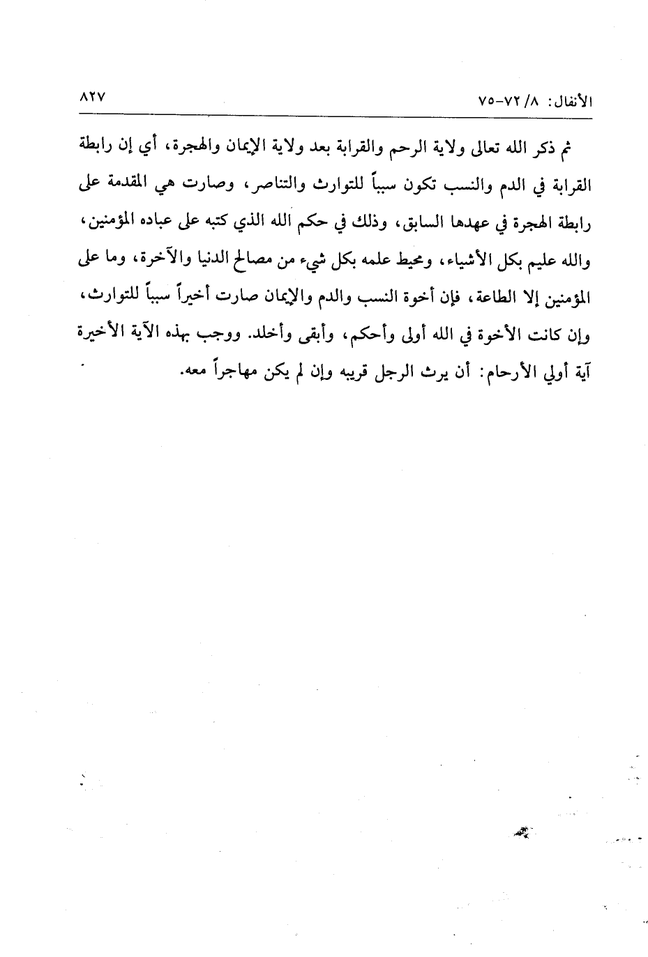 ثم ذكر الله تعالى ولاية الرحم والقرابة بعد ولاية الإيمان والهجرة، أي إن رابطة القرابة في الدم والنسب تكون سببا للتوارث والتناصر، وصارت هي المقدمة على رابطة الهجرة في عهدها السابق، وذلك في حكم الله الذي كتبه على عباده المؤمنين، والله عليم بكل الأشياء، ومحيط علمه بكل شيء من مصالح الدنيا والآخرة، وما على المؤمنين إلا الطاعة، فإن أخوة النسب والدم والإيمان صارت أخيرا سببا للتوارث، وإن كانت الأخوة في الله أولى وأحكم، وأبقى وأخلد. ووجب بهذه الآية الأخيرة آية أولي الأرحام: أن يرث الرجل قريبه وإن لم يكن مهاجرا معه.