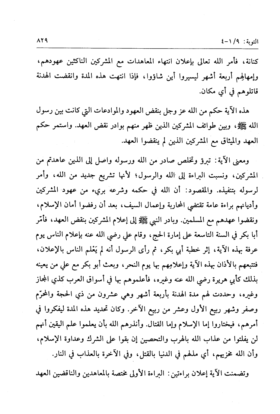 ومعنى الآية: تبرؤ وتخلص صادر من الله ورسوله واصل إلى الذين عاهدتم من المشركين، ونسبت البراءة إلى الله والرسول لأنها تشريع جديد من الله، وأمر لرسوله بتنفيذه. والمقصود: أن الله في حكمه وشرعه بريء من عهود المشركين وأديانهم براءة عامة تقتضي المحاربة وإعمال السيف، بعد أن رفضوا أمان الإسلام، ونقضوا عهدهم مع المسلمين. وبادر النبي صلّى الله عليه وسلّم إلى إعلام المشركين بنقض العهد، فأمّر أبا بكر في السنة التاسعة على إمارة الحج، وقام علي رضي الله عنه بإعلام الناس يوم عرفة بهذه الآية، إثر خطبة أبي بكر، ثم رأى الرسول أنه لم يعلم الناس بالإعلان، فتتبعهم بالأذان بهذه الآية وإعلامهم بها يوم النحر، وبعث أبو بكر مع علي من يعينه بذلك كأبي هريرة رضي الله عنه وغيره، فأعلموهم بها في أسواق العرب كذي المجاز وغيره، وحددت لهم مدة الهدنة بأربعة أشهر وهي عشرون من ذي الحجة والمحرّم وصفر وشهر ربيع الأول وعشر من ربيع الآخر. وكان تحديد هذه المدة ليفكروا في أمرهم، فيختاروا إما الإسلام وإما القتال. وأنذرهم الله بأن يعلموا علم اليقين أنهم لن يفلتوا من عذاب الله بالهرب والتحصين إن بقوا على الشرك وعداوة الإسلام، وأن الله مخزيهم، أي مذلهم في الدنيا بالقتل، وفي الآخرة بالعذاب في النار.