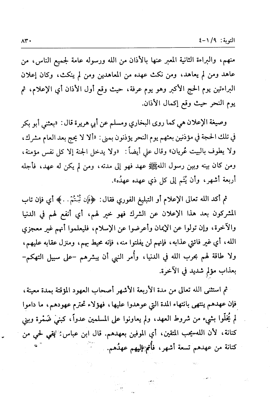 منهم، والبراءة الثانية المعبر عنها بالأذان من الله ورسوله عامة لجميع الناس، من عاهد ومن لم يعاهد، ومن نكث عهده من المعاهدين ومن لم ينكث، وكان إعلان البراءتين يوم الحج الأكبر وهو يوم عرفة، حيث وقع أول الأذان أي الاعلام، ثم يوم النحر حيث وقع إكمال الأذان.