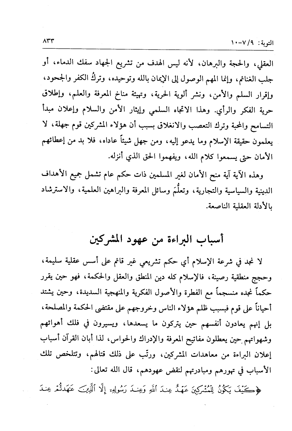 العقلي، والحجة والبرهان، لأنه ليس الهدف من تشريع الجهاد سفك الدماء، أو جلب الغنائم، وإنما المهم الوصول إلى الإيمان بالله وتوحيده، وترك الكفر والجحود، وإقرار السلم والأمن، ونشر ألوية الحرية، وتهيئة مناخ المعرفة والعلم، وإطلاق حرية الفكر والرأي. وهذا الاتجاه السلمي وإيثار الأمن والسلام وإعلان مبدأ التسامح والمحبة وترك التعصب والانغلاق بسبب أن هؤلاء المشركين قوم جهلة، لا يعلمون حقيقة الإسلام وما يدعو إليه، ومن جهل شيئا عاداه، فلا بد من إعطائهم الأمان حتى يسمعوا كلام الله، ويفهموا الحق الذي أنزله.