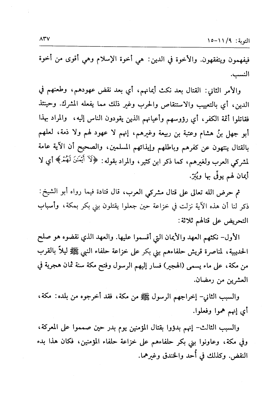 والسبب الثالث- إنهم بدؤوا بقتال المؤمنين يوم بدر حين صمموا على المعركة، وفي مكة، وعاونوا بني بكر حلفاءهم على خزاعة حلفاء المؤمنين، فكان هذا بدء النقض. وكذلك في أحد والخندق وغيرهما.