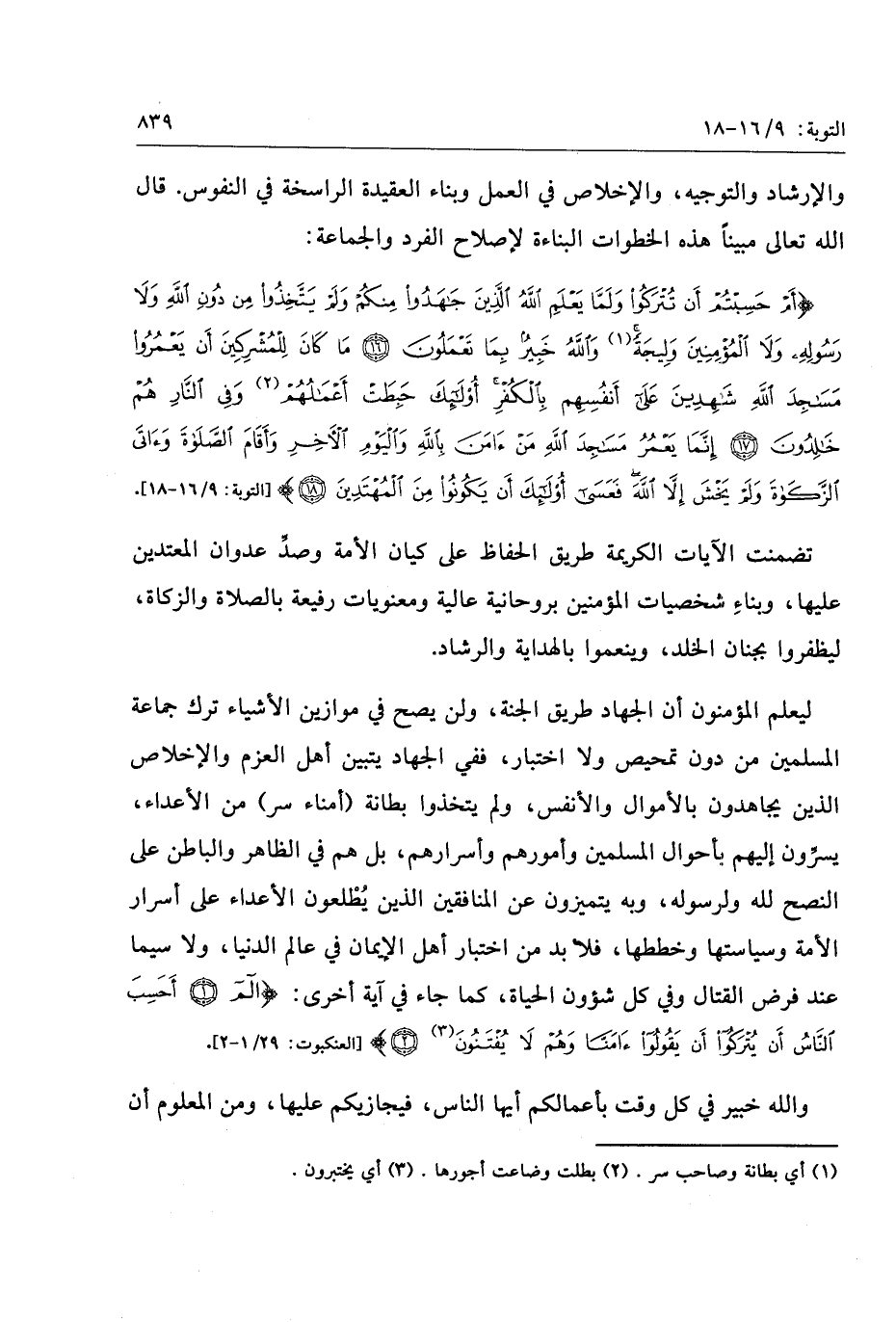 أَمْ حَسِبْتُمْ أَنْ تُتْرَكُوا وَلَمَّا يَعْلَمِ اللَّهُ الَّذِينَ جاهَدُوا مِنْكُمْ وَلَمْ يَتَّخِذُوا مِنْ دُونِ اللَّهِ وَلا رَسُولِهِ وَلا الْمُؤْمِنِينَ وَلِيجَةً وَاللَّهُ خَبِيرٌ بِما تَعْمَلُونَ (16) ما كانَ لِلْمُشْرِكِينَ أَنْ يَعْمُرُوا مَساجِدَ اللَّهِ شاهِدِينَ عَلى أَنْفُسِهِمْ بِالْكُفْرِ أُولئِكَ حَبِطَتْ أَعْمالُهُمْ وَفِي النَّارِ هُمْ خالِدُونَ (17) إِنَّما يَعْمُرُ مَساجِدَ اللَّهِ مَنْ آمَنَ بِاللَّهِ وَالْيَوْمِ الْآخِرِ وَأَقامَ الصَّلاةَ وَآتَى الزَّكاةَ وَلَمْ يَخْشَ إِلاَّ اللَّهَ فَعَسى أُولئِكَ أَنْ يَكُونُوا مِنَ الْمُهْتَدِينَ (18)