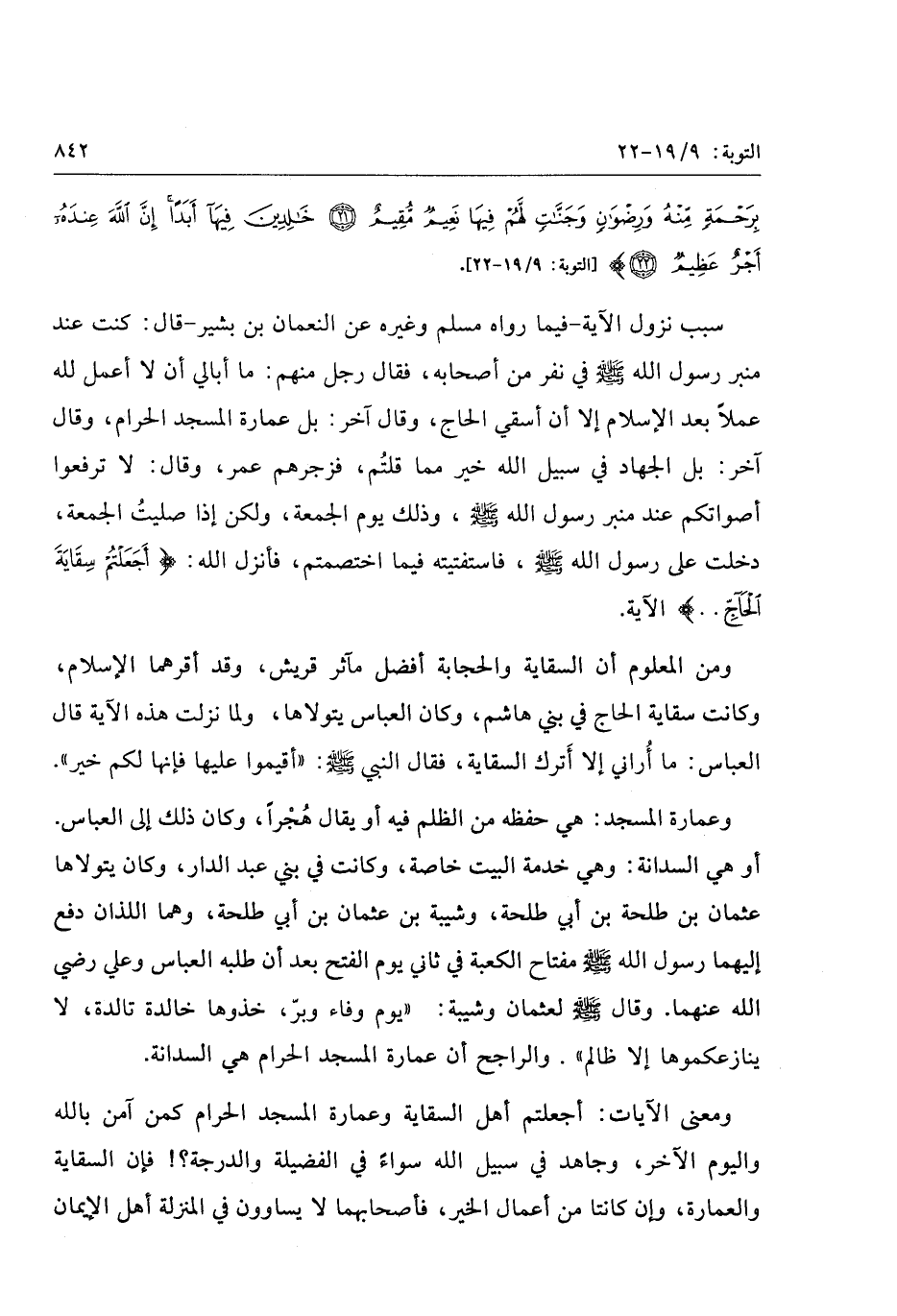 رواه مسلم وغيره عن النعمان بن بشير- قال: كنت عند منبر رسول الله صلّى الله عليه وسلّم في نفر من أصحابه، فقال رجل منهم: ما أبالي أن لا أعمل لله عملا بعد الإسلام إلا أن أسقي الحاج، وقال آخر: بل عمارة المسجد الحرام، وقال آخر: بل الجهاد في سبيل الله خير مما قلتم، فزجرهم عمر، وقال: لا ترفعوا أصواتكم عند منبر رسول الله صلّى الله عليه وسلم، وذلك يوم الجمعة، ولكن إذا صليت الجمعة، دخلت على رسول الله صلّى الله عليه وسلم، فاستفتيته فيما اختصمتم، فأنزل الله: أَجَعَلْتُمْ سِقايَةَ الْحاجِّ.. الآية.