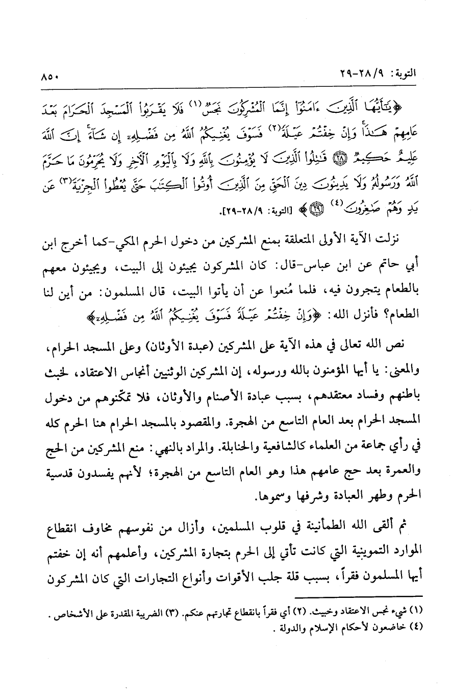 يا أَيُّهَا الَّذِينَ آمَنُوا إِنَّمَا الْمُشْرِكُونَ نَجَسٌ فَلا يَقْرَبُوا الْمَسْجِدَ الْحَرامَ بَعْدَ عامِهِمْ هذا وَإِنْ خِفْتُمْ عَيْلَةً فَسَوْفَ يُغْنِيكُمُ اللَّهُ مِنْ فَضْلِهِ إِنْ شاءَ إِنَّ اللَّهَ عَلِيمٌ حَكِيمٌ (28) قاتِلُوا الَّذِينَ لا يُؤْمِنُونَ بِاللَّهِ وَلا بِالْيَوْمِ الْآخِرِ وَلا يُحَرِّمُونَ ما حَرَّمَ اللَّهُ وَرَسُولُهُ وَلا يَدِينُونَ دِينَ الْحَقِّ مِنَ الَّذِينَ أُوتُوا الْكِتابَ حَتَّى يُعْطُوا الْجِزْيَةَ عَنْ يَدٍ وَهُمْ صاغِرُونَ (29)