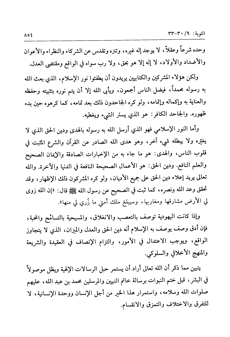 وأما النور الإسلامي فهو الذي أرسل الله به رسوله بالهدى ودين الحق الذي لا يغيّره ولا يبطله شيء آخر، وهو هدى الله الصادر عن القرآن والشرع المثبت في قلوب الناس، والهدى: هو ما جاء به من الإخبارات الصادقة والإيمان الصحيح والعلم النافع. ودين الحق: هو الأعمال الصحيحة النافعة في الدنيا والآخرة. والله تعالى يريد إعلاء دين الحق على جميع الأديان، ولو كره المشركون ذلك الإظهار، وقد تحقق وعد الله ونصره، كما