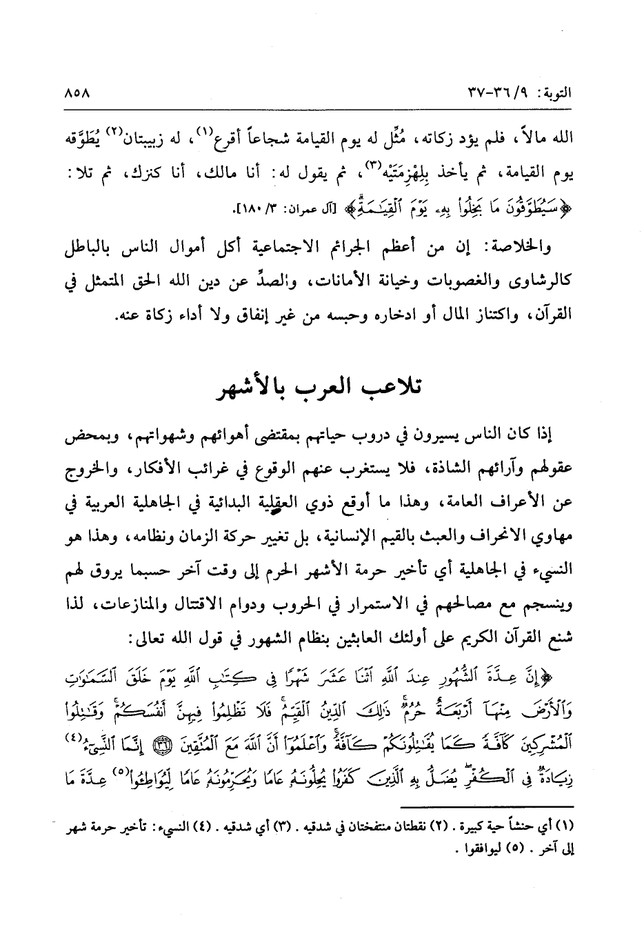 إِنَّ عِدَّةَ الشُّهُورِ عِنْدَ اللَّهِ اثْنا عَشَرَ شَهْراً فِي كِتابِ اللَّهِ يَوْمَ خَلَقَ السَّماواتِ وَالْأَرْضَ مِنْها أَرْبَعَةٌ حُرُمٌ ذلِكَ الدِّينُ الْقَيِّمُ فَلا تَظْلِمُوا فِيهِنَّ أَنْفُسَكُمْ وَقاتِلُوا الْمُشْرِكِينَ كَافَّةً كَما يُقاتِلُونَكُمْ كَافَّةً وَاعْلَمُوا أَنَّ اللَّهَ مَعَ الْمُتَّقِينَ (36) إِنَّمَا النَّسِيءُ زِيادَةٌ فِي الْكُفْرِ يُضَلُّ بِهِ الَّذِينَ كَفَرُوا يُحِلُّونَهُ عاماً وَيُحَرِّمُونَهُ عاماً لِيُواطِؤُا عِدَّةَ ما حَرَّمَ اللَّهُ فَيُحِلُّوا ما حَرَّمَ اللَّهُ زُيِّنَ لَهُمْ سُوءُ أَعْمالِهِمْ وَاللَّهُ لا يَهْدِي الْقَوْمَ الْكافِرِينَ (37)