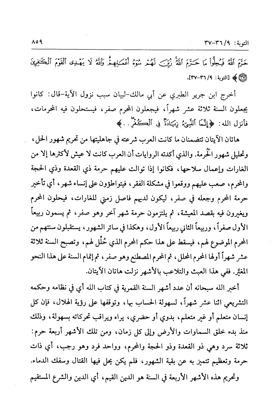 أخرج ابن جرير الطبري عن أبي مالك- لبيان سبب نزول الآية- قال: كانوا يجعلون السنة ثلاثة عشر شهرا، فيجعلون المحرم صفر، فيستحلون فيه المحرمات، فأنزل الله: إِنَّمَا النَّسِيءُ زِيادَةٌ فِي الْكُفْرِ..