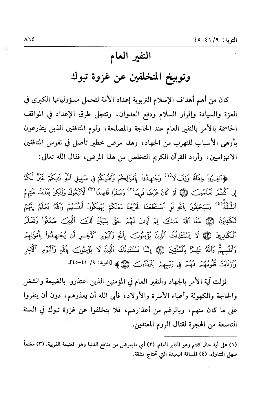 كان من أهم أهداف الإسلام التربوية إعداد الأمة لتحمل مسئولياتها الكبرى في العزة والسيادة وإقرار السلام ودفع العدوان، وتتجلى طرق الإعداد في المواقف الحاسمة بالأمر بالنفير العام عند الحاجة والمصلحة، ولوم المنافقين الذين يتذرعون بأوهى الأسباب للتهرب من الجهاد، وهذا مرض خطير تأصل في نفوس المنافقين الانهزاميين، وأراد القرآن الكريم التخلص من هذا المرض، فقال الله تعالى: