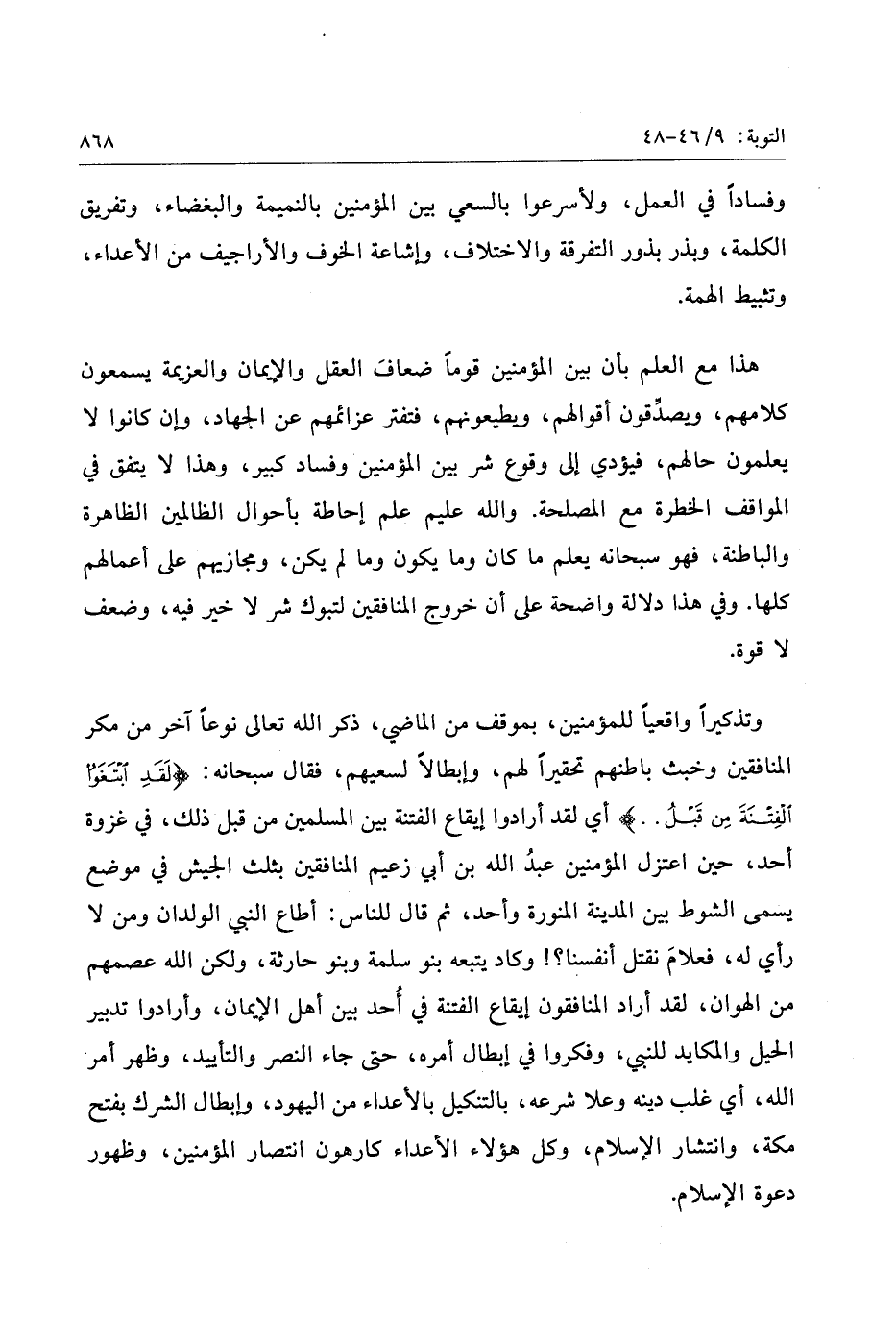 وتذكيرا واقعيا للمؤمنين، بموقف من الماضي، ذكر الله تعالى نوعا آخر من مكر المنافقين وخبث باطنهم تحقيرا لهم، وإبطالا لسعيهم، فقال سبحانه: لَقَدِ ابْتَغَوُا الْفِتْنَةَ مِنْ قَبْلُ.. أي لقد أرادوا إيقاع الفتنة بين المسلمين من قبل ذلك، في غزوة أحد، حين اعتزل المؤمنين عبد الله بن أبي زعيم المنافقين بثلث الجيش في موضع يسمى الشوط بين المدينة المنورة وأحد، ثم قال للناس: أطاع النبي الولدان ومن لا رأي له، فعلام نقتل أنفسنا؟! وكاد يتبعه بنو سلمة وبنو حارثة، ولكن الله عصمهم من الهوان، لقد أراد المنافقون إيقاع الفتنة في أحد بين أهل الإيمان، وأرادوا تدبير الحيل والمكايد للنبي، وفكروا في إبطال أمره، حتى جاء النصر والتأييد، وظهر أمر الله، أي غلب دينه وعلا شرعه، بالتنكيل بالأعداء من اليهود، وإبطال الشرك بفتح مكة، وانتشار الإسلام، وكل هؤلاء الأعداء كارهون انتصار المؤمنين، وظهور دعوة الإسلام.