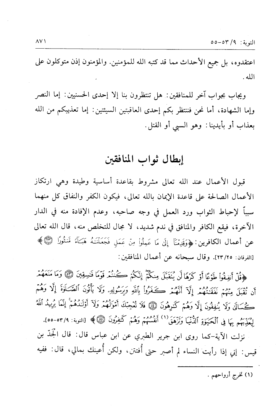 قُلْ أَنْفِقُوا طَوْعاً أَوْ كَرْهاً لَنْ يُتَقَبَّلَ مِنْكُمْ إِنَّكُمْ كُنْتُمْ قَوْماً فاسِقِينَ (53) وَما مَنَعَهُمْ أَنْ تُقْبَلَ مِنْهُمْ نَفَقاتُهُمْ إِلاَّ أَنَّهُمْ كَفَرُوا بِاللَّهِ وَبِرَسُولِهِ وَلا يَأْتُونَ الصَّلاةَ إِلاَّ وَهُمْ كُسالى وَلا يُنْفِقُونَ إِلاَّ وَهُمْ كارِهُونَ (54) فَلا تُعْجِبْكَ أَمْوالُهُمْ وَلا أَوْلادُهُمْ إِنَّما يُرِيدُ اللَّهُ لِيُعَذِّبَهُمْ بِها فِي الْحَياةِ الدُّنْيا وَتَزْهَقَ أَنْفُسُهُمْ وَهُمْ كافِرُونَ (55)