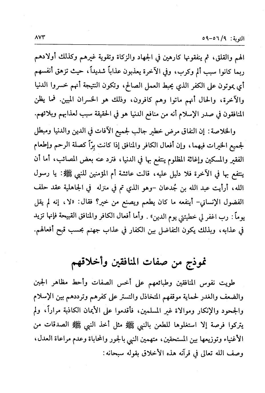 الهم والقلق، ثم ينفقونها كارهين في الجهاد والزكاة وتقوية غيرهم وكذلك أولادهم ربما كانوا سبب ألم وكرب، وفي الآخرة يعذبون عذابا شديدا، حيث تزهق أنفسهم أي يموتون على الكفر الذي يحبط العمل الصالح، وتكون النتيجة أنهم خسروا الدنيا والآخرة، والحال أنهم ماتوا وهم كافرون، وذلك هو الخسران المبين. فما يظن المنافقون في صدر الإسلام أنه من منافع الدنيا هو في الحقيقة سبب لعذابهم وبلائهم.