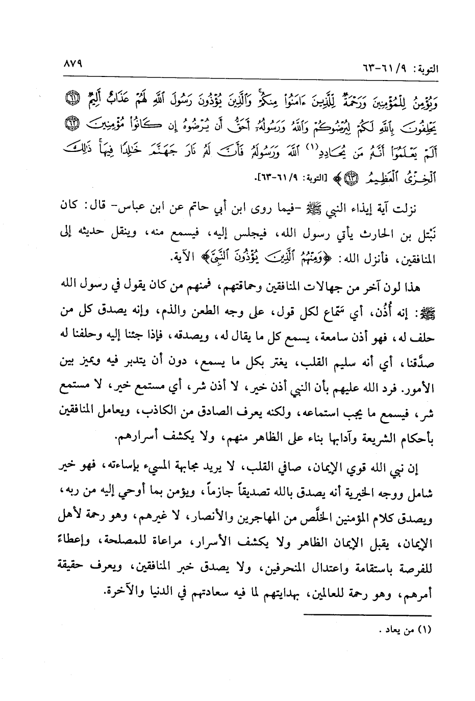 إن نبي الله قوي الإيمان، صافي القلب، لا يريد مجابهة المسيء بإساءته، فهو خير شامل ووجه الخيرية أنه يصدق بالله تصديقا جازما، ويؤمن بما أوحي إليه من ربه، ويصدق كلام المؤمنين الخلّص من المهاجرين والأنصار، لا غيرهم، وهو رحمة لأهل الإيمان، يقبل الإيمان الظاهر ولا يكشف الأسرار، مراعاة للمصلحة، وإعطاء للفرصة باستقامة واعتدال المنحرفين، ولا يصدق خبر المنافقين، ويعرف حقيقة أمرهم، وهو رحمة للعالمين، بهدايتهم لما فيه سعادتهم في الدنيا والآخرة.