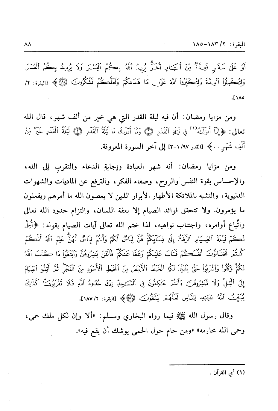 ومن مزايا رمضان: أن فيه ليلة القدر التي هي خير من ألف شهر، قال الله تعالى: إِنَّا أَنْزَلْناهُ «1» فِي لَيْلَةِ الْقَدْرِ وَما أَدْراكَ ما لَيْلَةُ الْقَدْرِ لَيْلَةُ الْقَدْرِ خَيْرٌ مِنْ أَلْفِ شَهْرٍ ... [القدر 97/ 1- 3] إلى آخر السورة المعروفة.