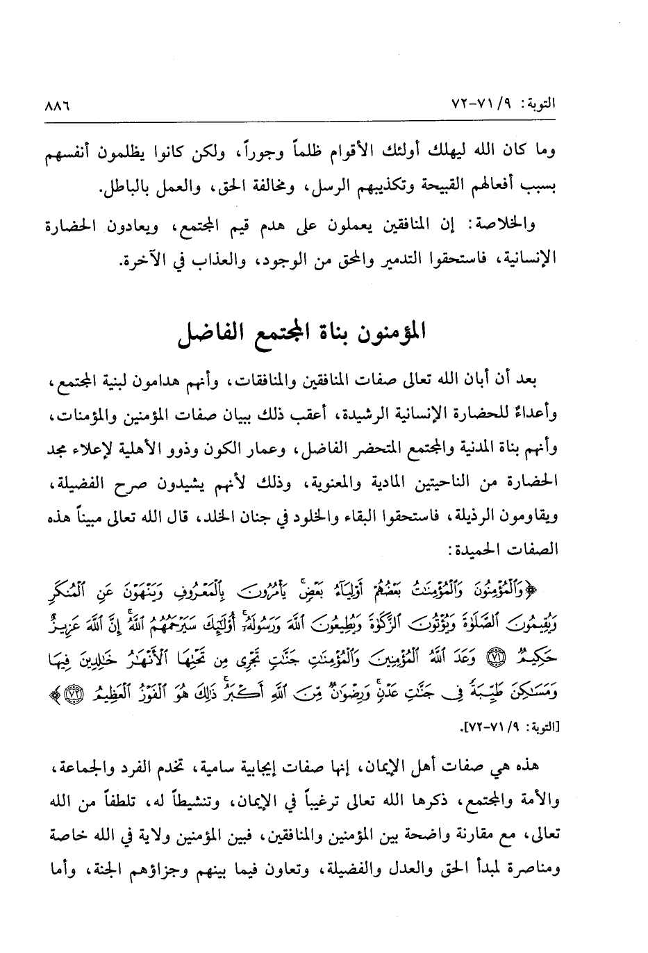 وَالْمُؤْمِنُونَ وَالْمُؤْمِناتُ بَعْضُهُمْ أَوْلِياءُ بَعْضٍ يَأْمُرُونَ بِالْمَعْرُوفِ وَيَنْهَوْنَ عَنِ الْمُنْكَرِ وَيُقِيمُونَ الصَّلاةَ وَيُؤْتُونَ الزَّكاةَ وَيُطِيعُونَ اللَّهَ وَرَسُولَهُ أُولئِكَ سَيَرْحَمُهُمُ اللَّهُ إِنَّ اللَّهَ عَزِيزٌ حَكِيمٌ (71) وَعَدَ اللَّهُ الْمُؤْمِنِينَ وَالْمُؤْمِناتِ جَنَّاتٍ تَجْرِي مِنْ تَحْتِهَا الْأَنْهارُ خالِدِينَ فِيها وَمَساكِنَ طَيِّبَةً فِي جَنَّاتِ عَدْنٍ وَرِضْوانٌ مِنَ اللَّهِ أَكْبَرُ ذلِكَ هُوَ الْفَوْزُ الْعَظِيمُ (72)