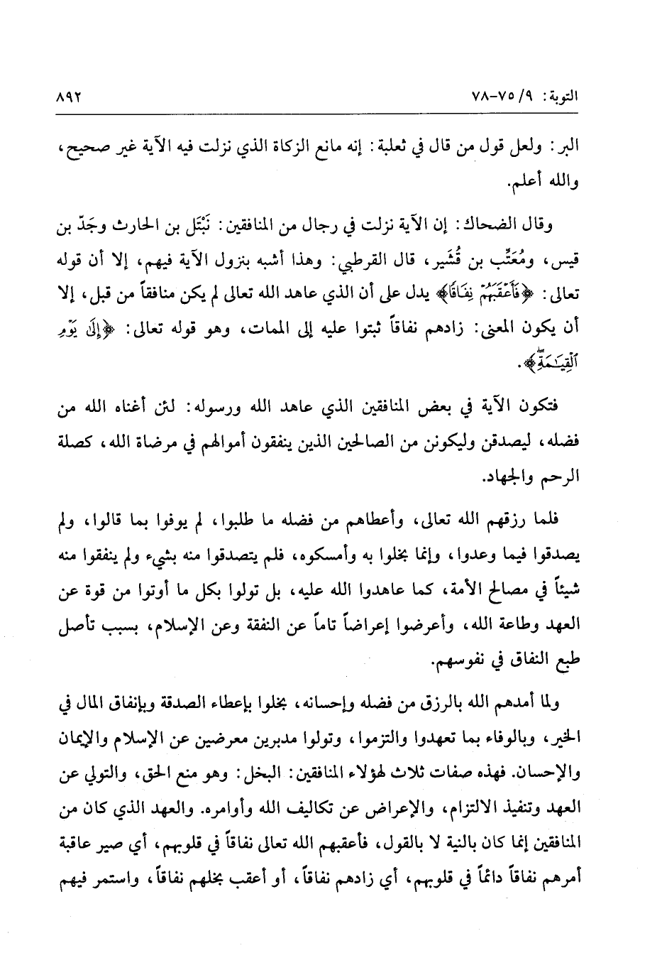 البر: ولعل قول من قال في ثعلبة: إنه مانع الزكاة الذي نزلت فيه الآية غير صحيح، والله أعلم.