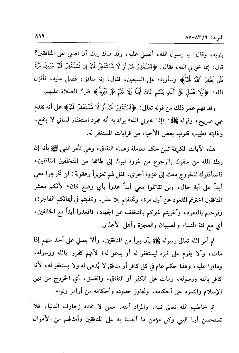 قال: إنما خيرني الله، فقال: اسْتَغْفِرْ لَهُمْ أَوْ لا تَسْتَغْفِرْ لَهُمْ إِنْ تَسْتَغْفِرْ لَهُمْ سَبْعِينَ مَرَّةً فَلَنْ يَغْفِرَ اللَّهُ لَهُمْ وسأزيده على السبعين، فقال: إنه منافق، فصلى عليه، فأنزل الله: وَلا تُصَلِّ عَلى أَحَدٍ مِنْهُمْ ماتَ أَبَداً وَلا تَقُمْ عَلى قَبْرِهِ فترك الصلاة عليهم.